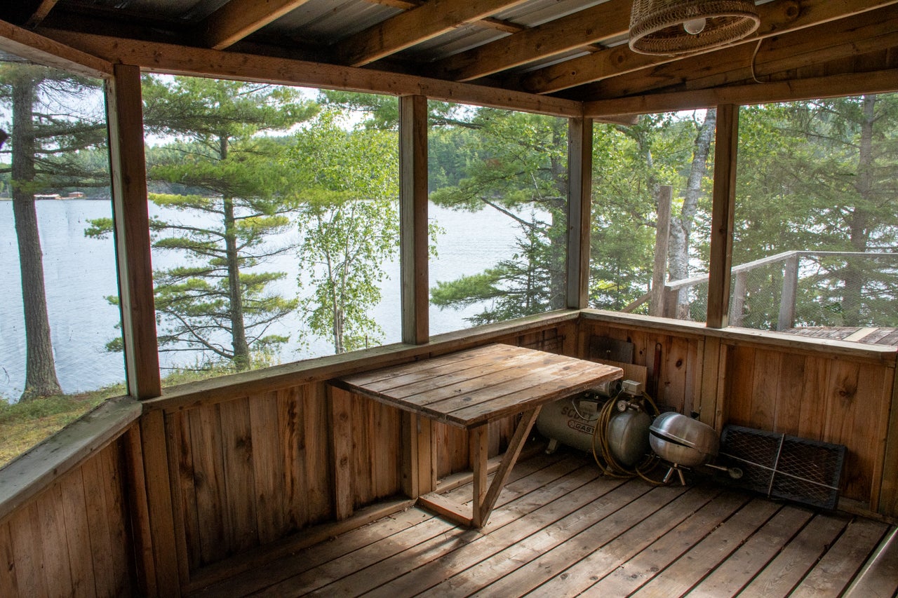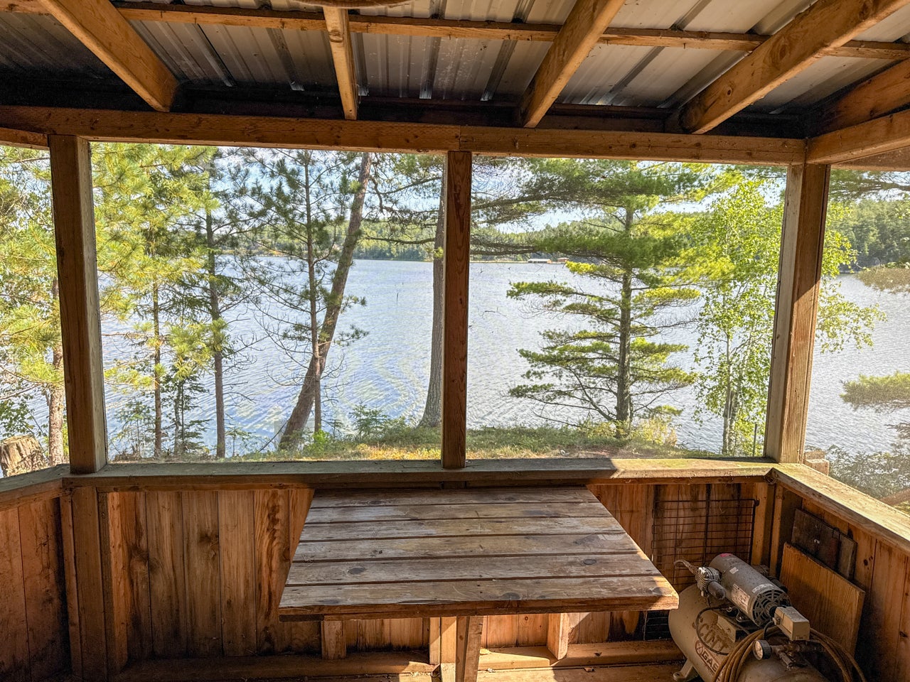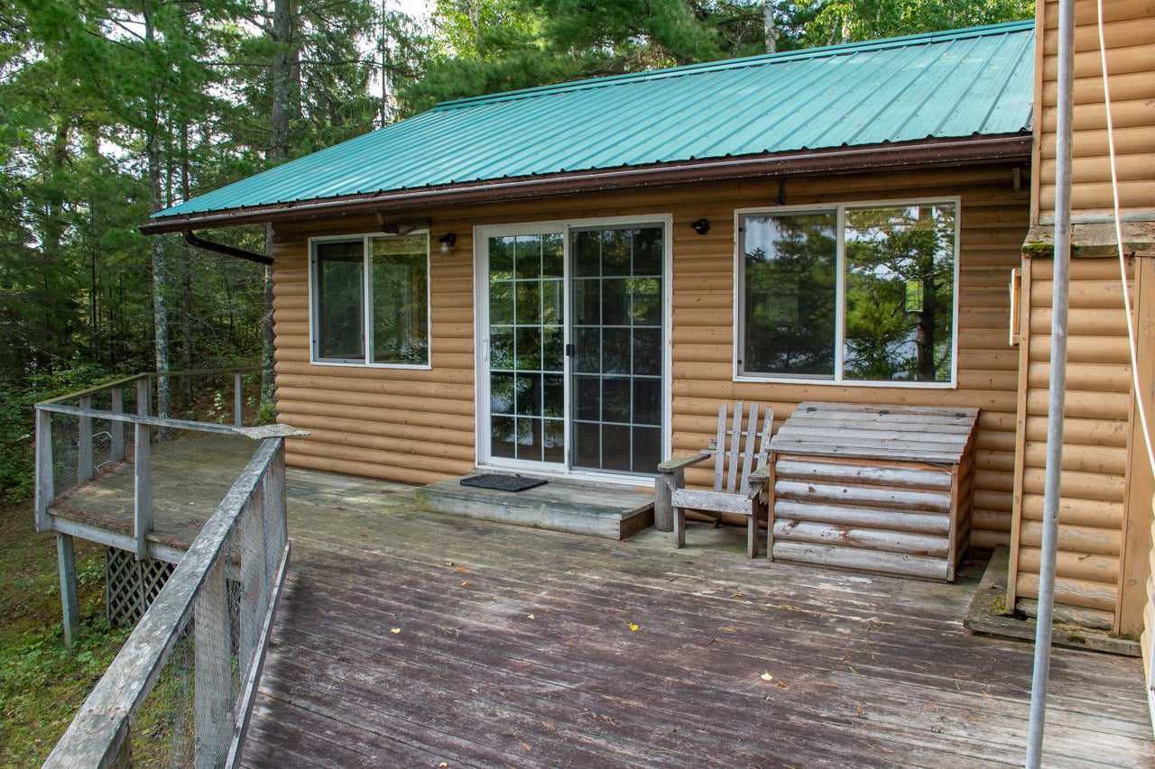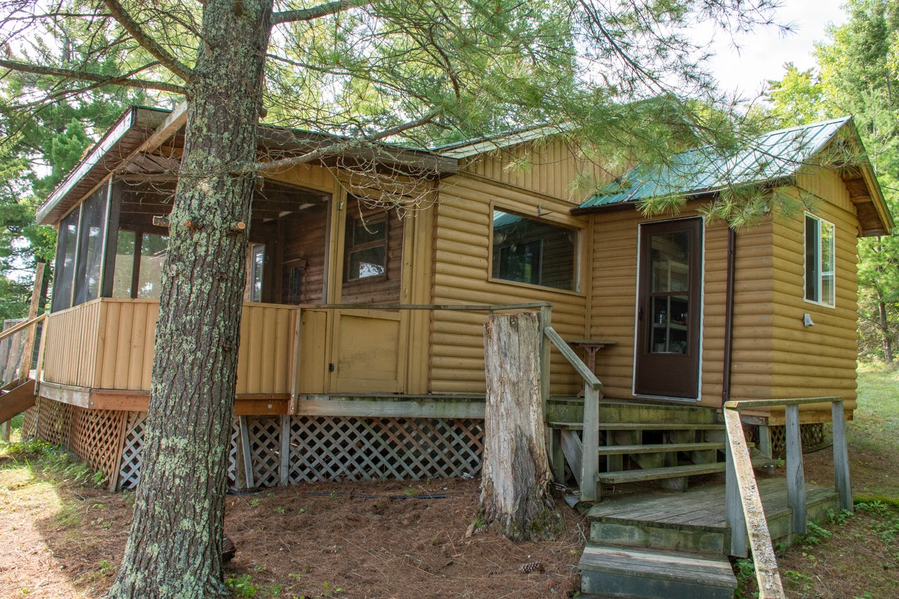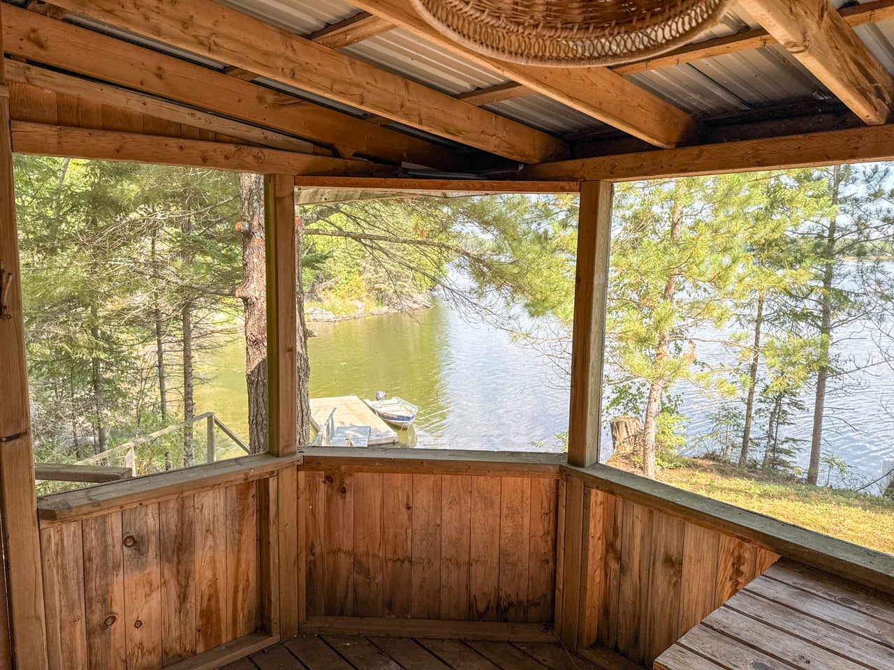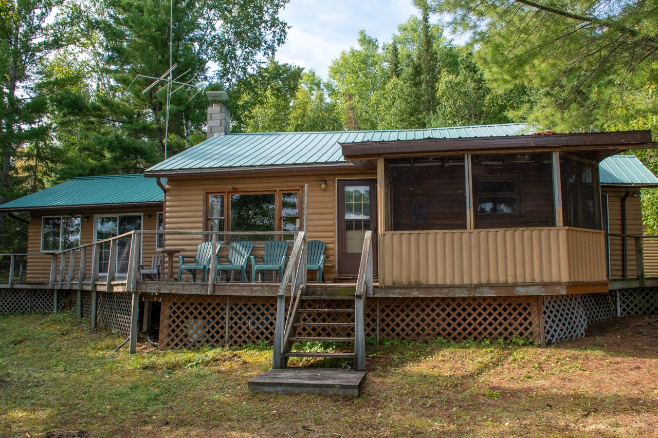 The main cabin—1,383 sq. ft. in total—blends vintage charm and modern space, with the original 1964 cabin featuring a vaulted ceiling, stone fireplace, kitchen, and open-concept living area. A 2002 addition brings a spacious bedroom/sitting room with sliding door access to a lakeside deck with an enclosed screen porch—perfect for morning coffee or relaxing in the evening after a day on the water.