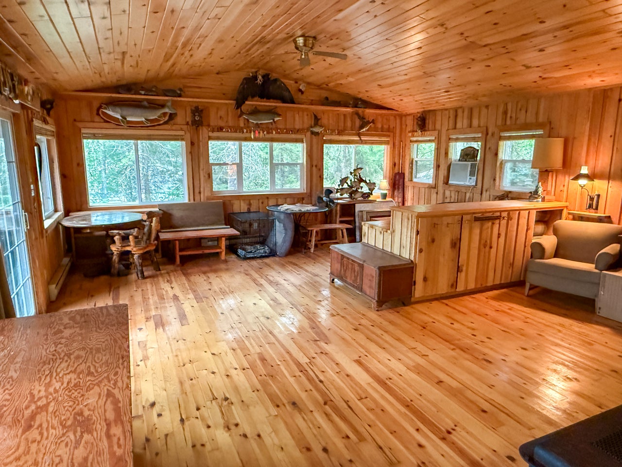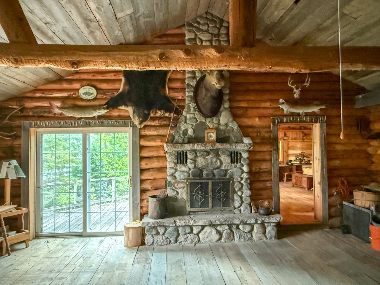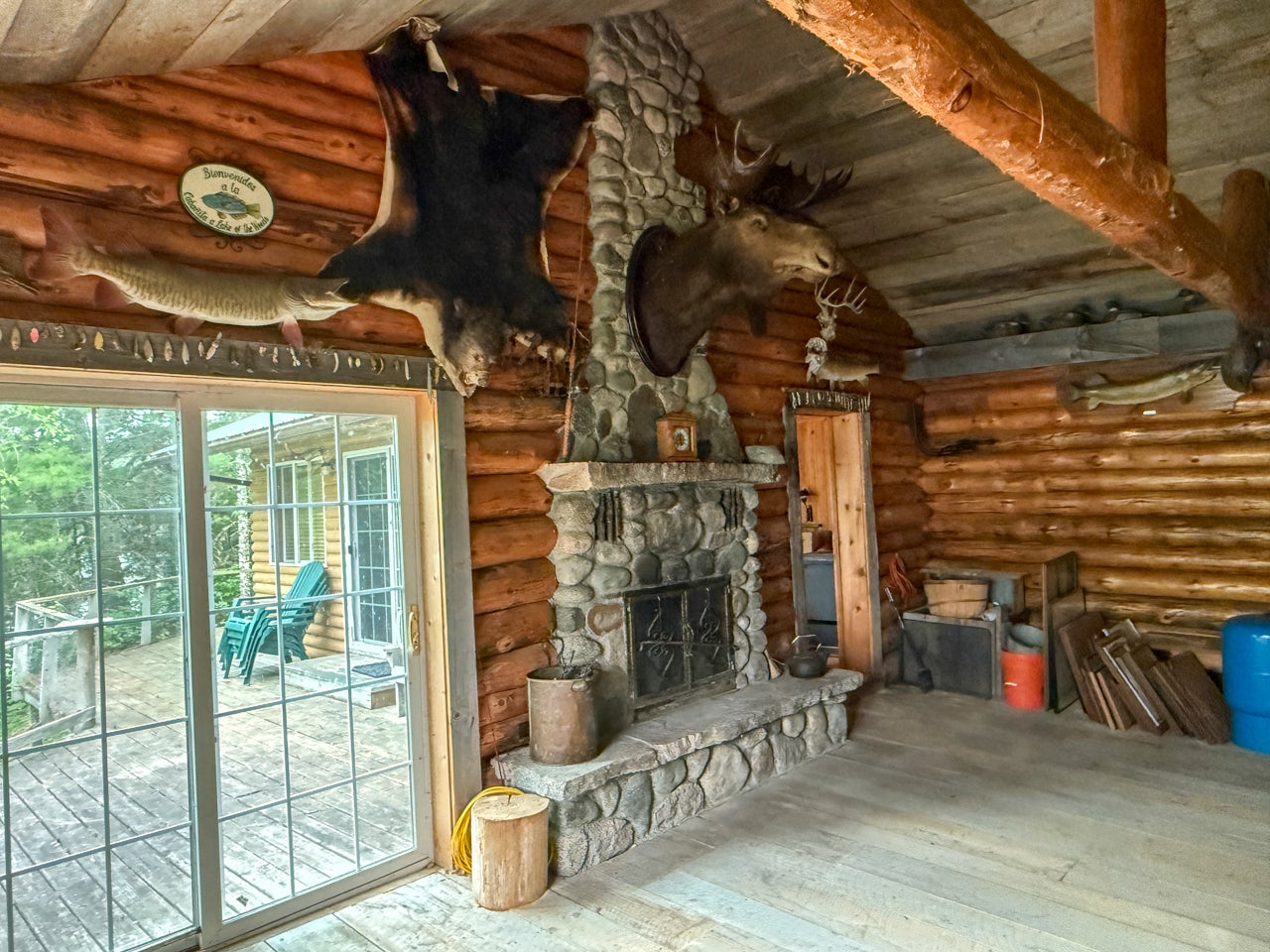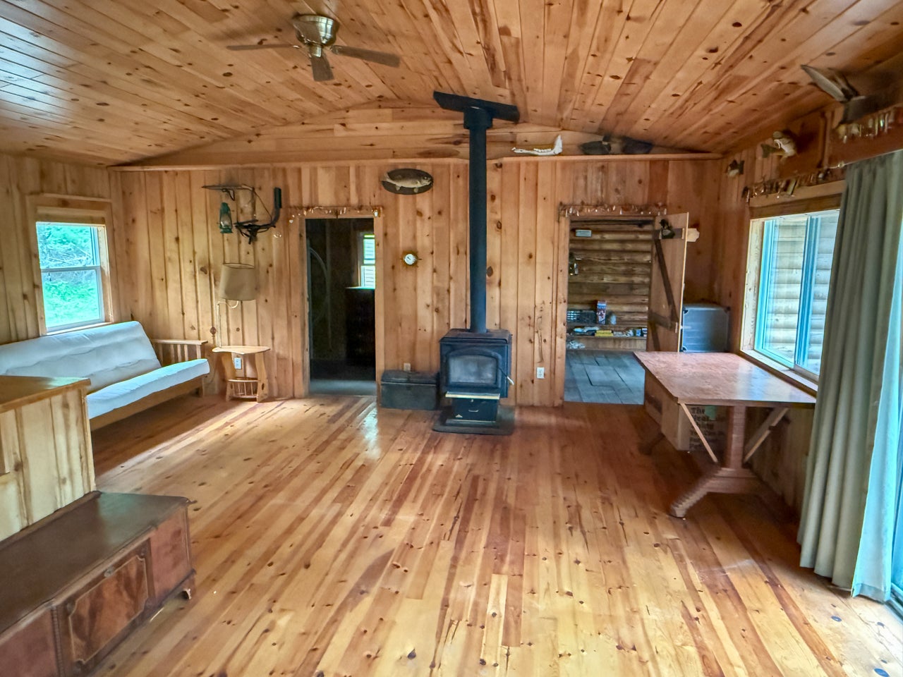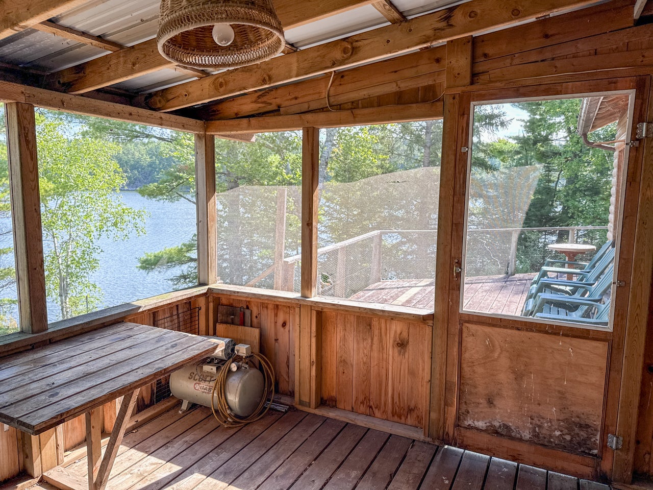 The main cabin—1,383 sq. ft. in total—blends vintage charm and modern space, with the original 1964 cabin featuring a vaulted ceiling, stone fireplace, kitchen, and open-concept living area. A 2002 addition brings a spacious bedroom/sitting room with sliding door access to a lakeside deck with an enclosed screen porch—perfect for morning coffee or relaxing in the evening after a day on the water.