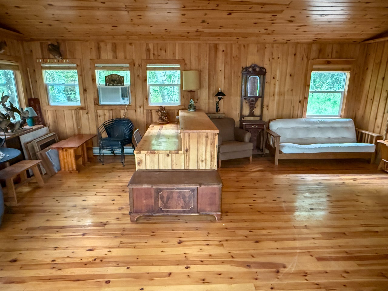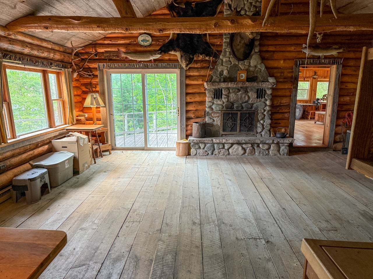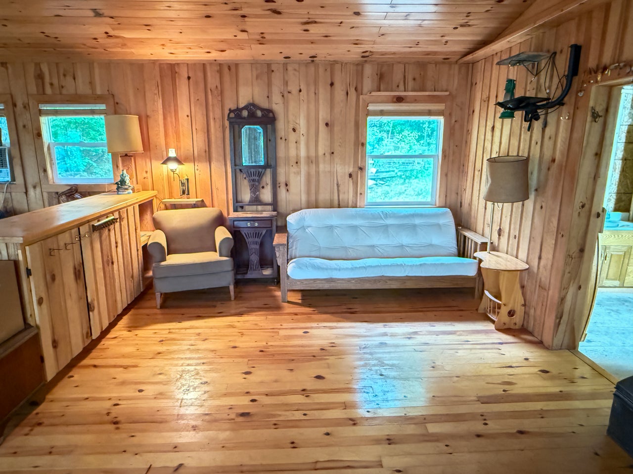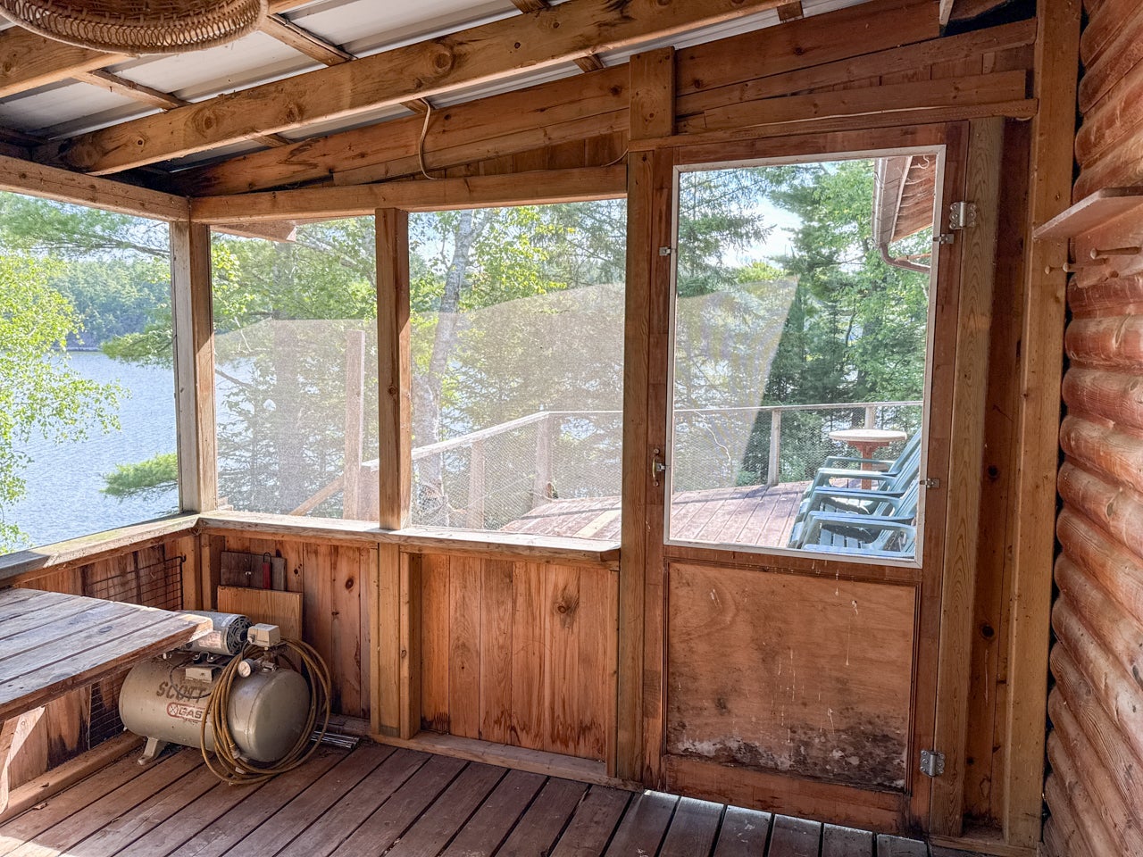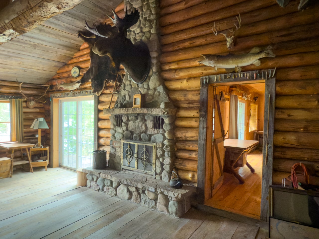 The main cabin—1,383 sq. ft. in total—blends vintage charm and modern space, with the original 1964 cabin featuring a vaulted ceiling, stone fireplace, kitchen, and open-concept living area. A 2002 addition brings a spacious bedroom/sitting room with sliding door access to a lakeside deck with an enclosed screen porch—perfect for morning coffee or relaxing in the evening after a day on the water.