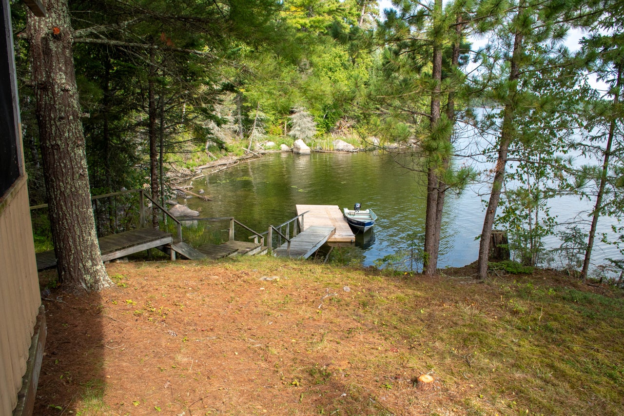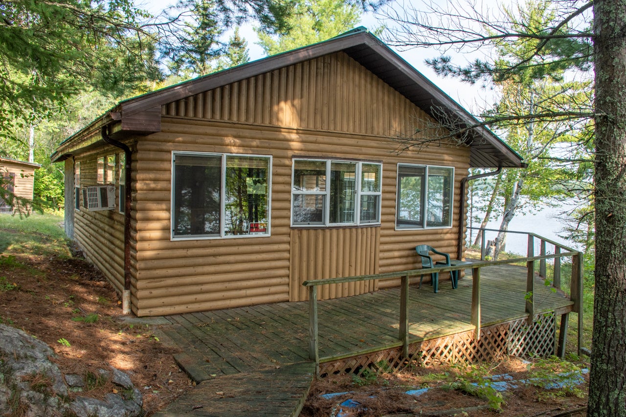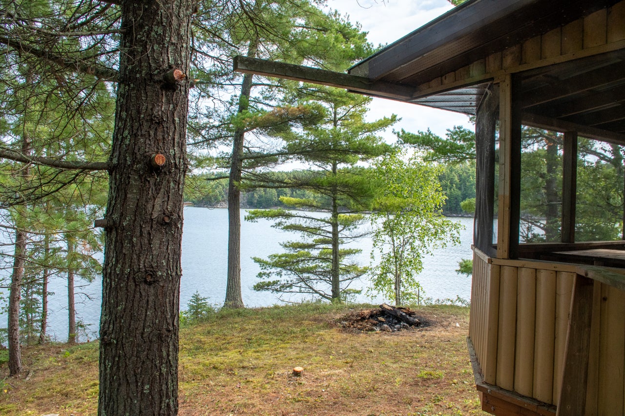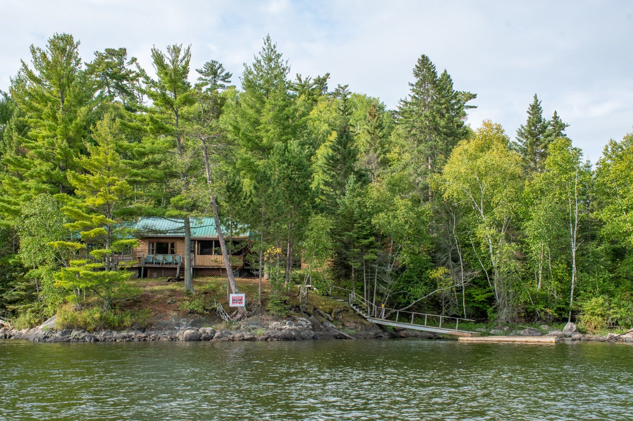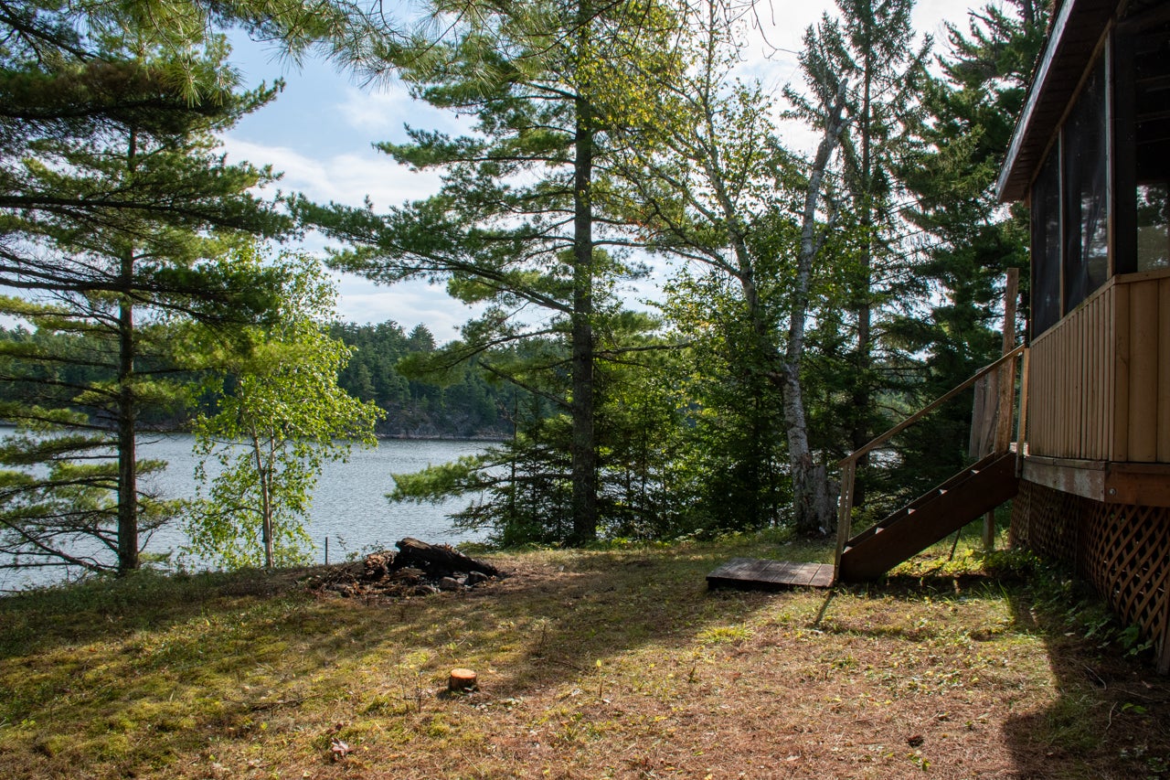 Cabin on Sabaskong Bay, Lake of the Woods. It's a nice setting, with the cabin situated close to the water's edge among some beautiful pine trees.