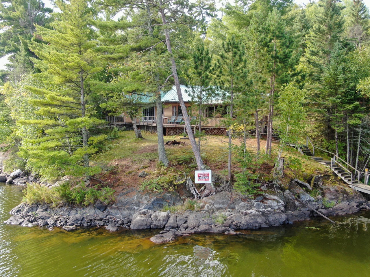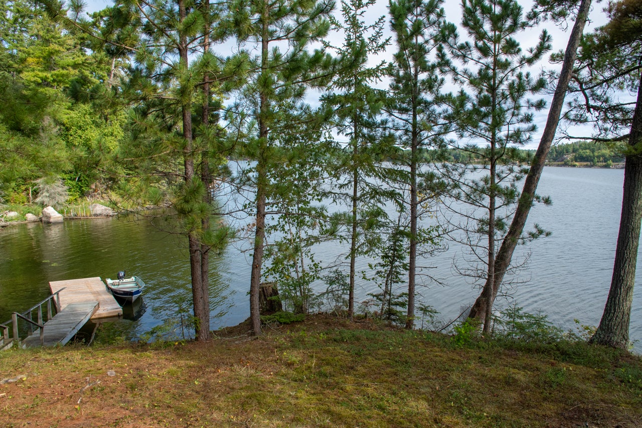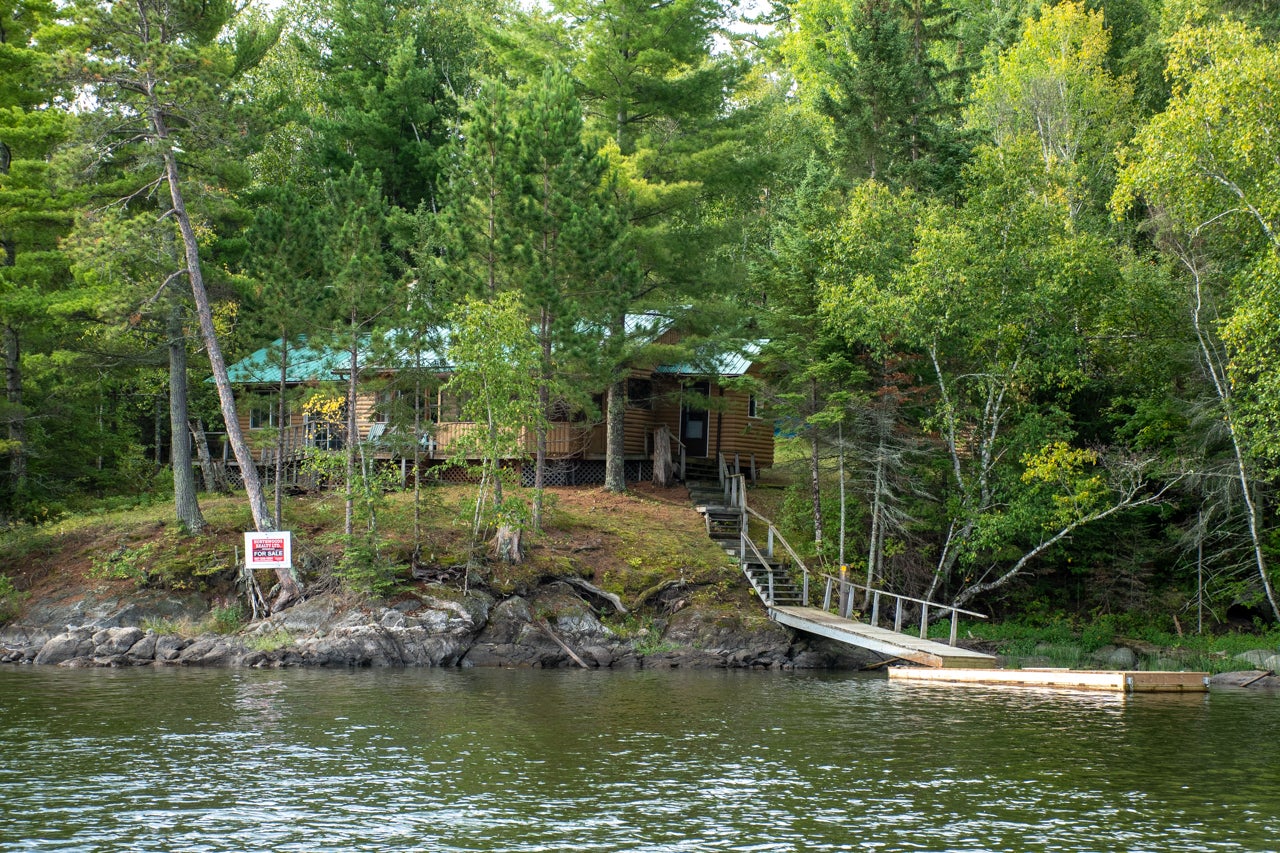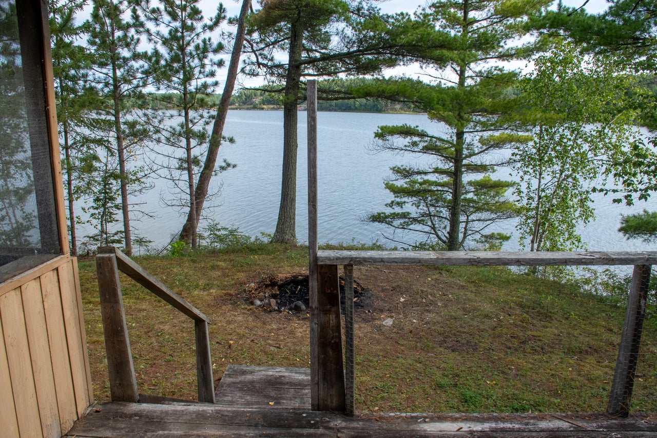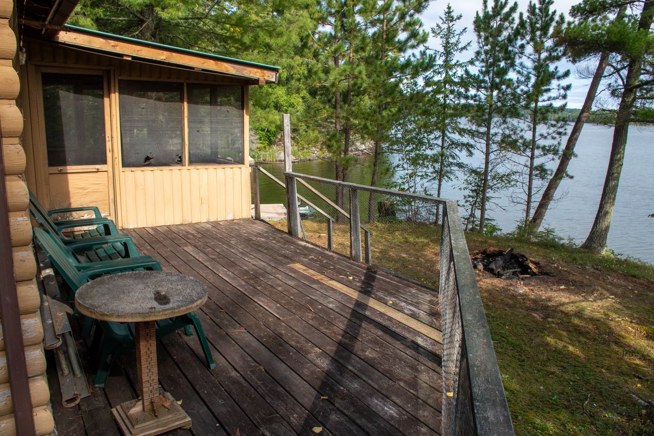 Cabin on Sabaskong Bay, Lake of the Woods. It's a nice setting, with the cabin situated close to the water's edge among some beautiful pine trees.