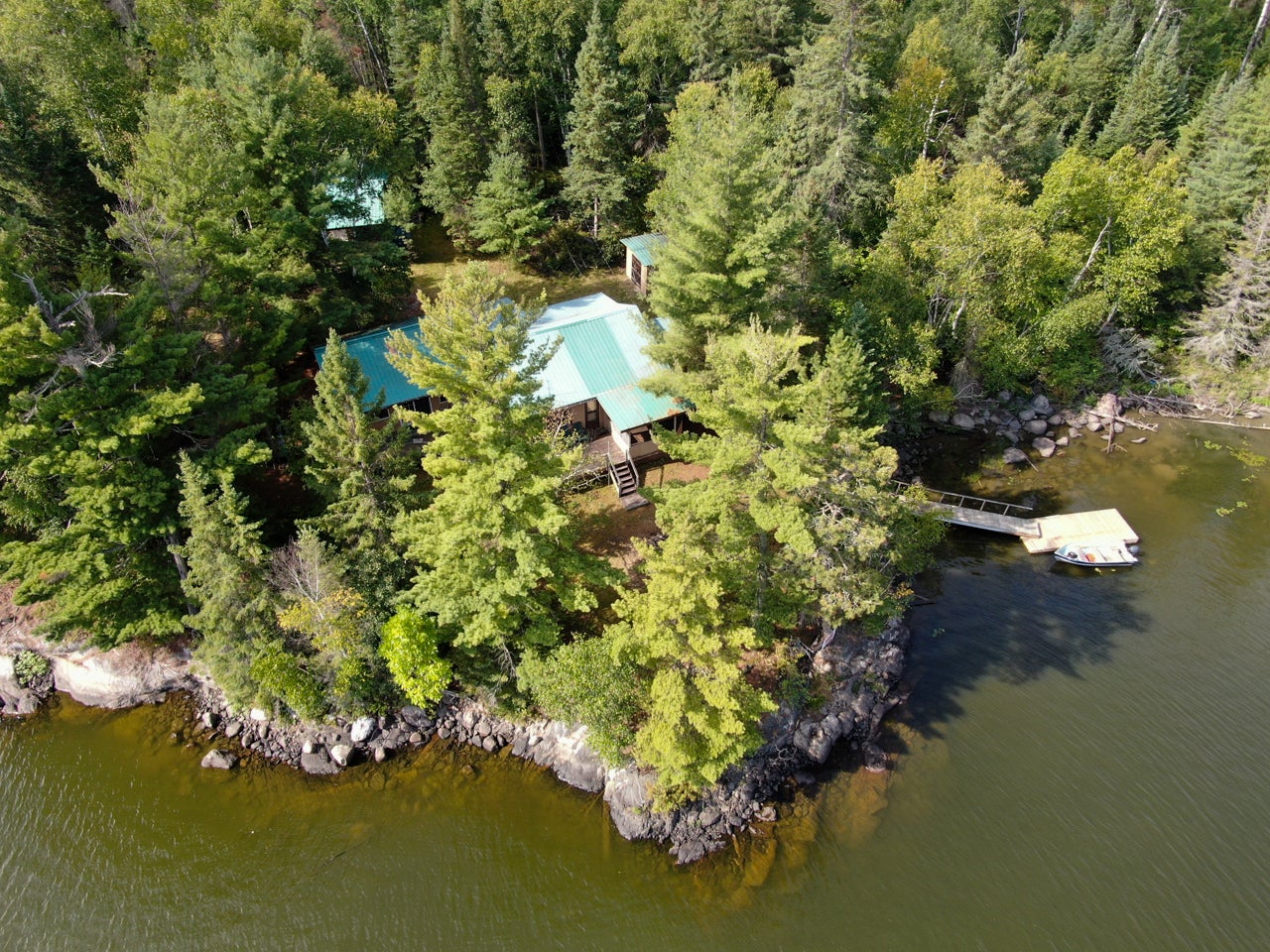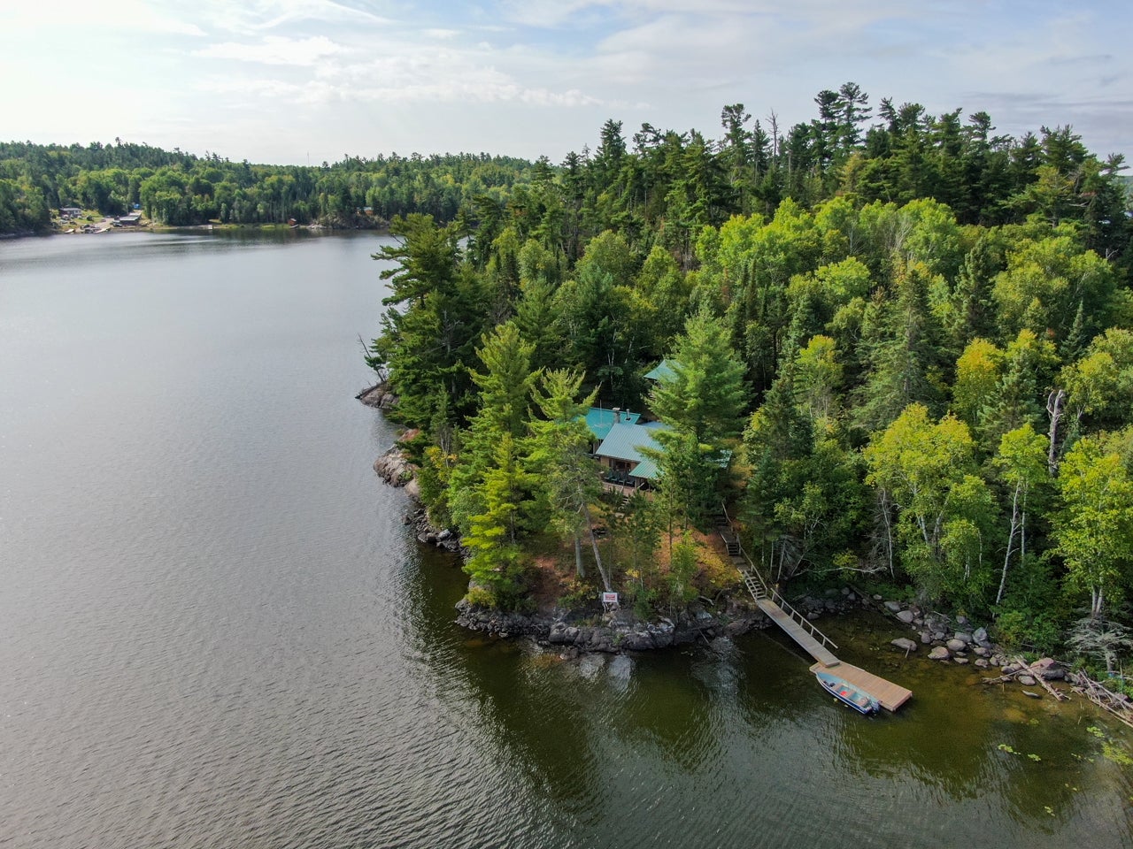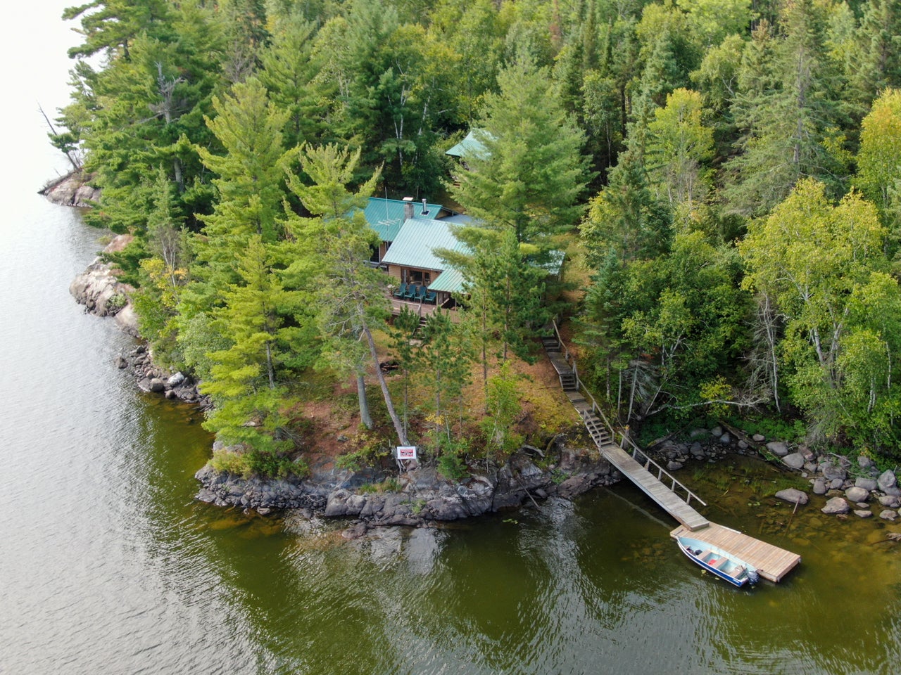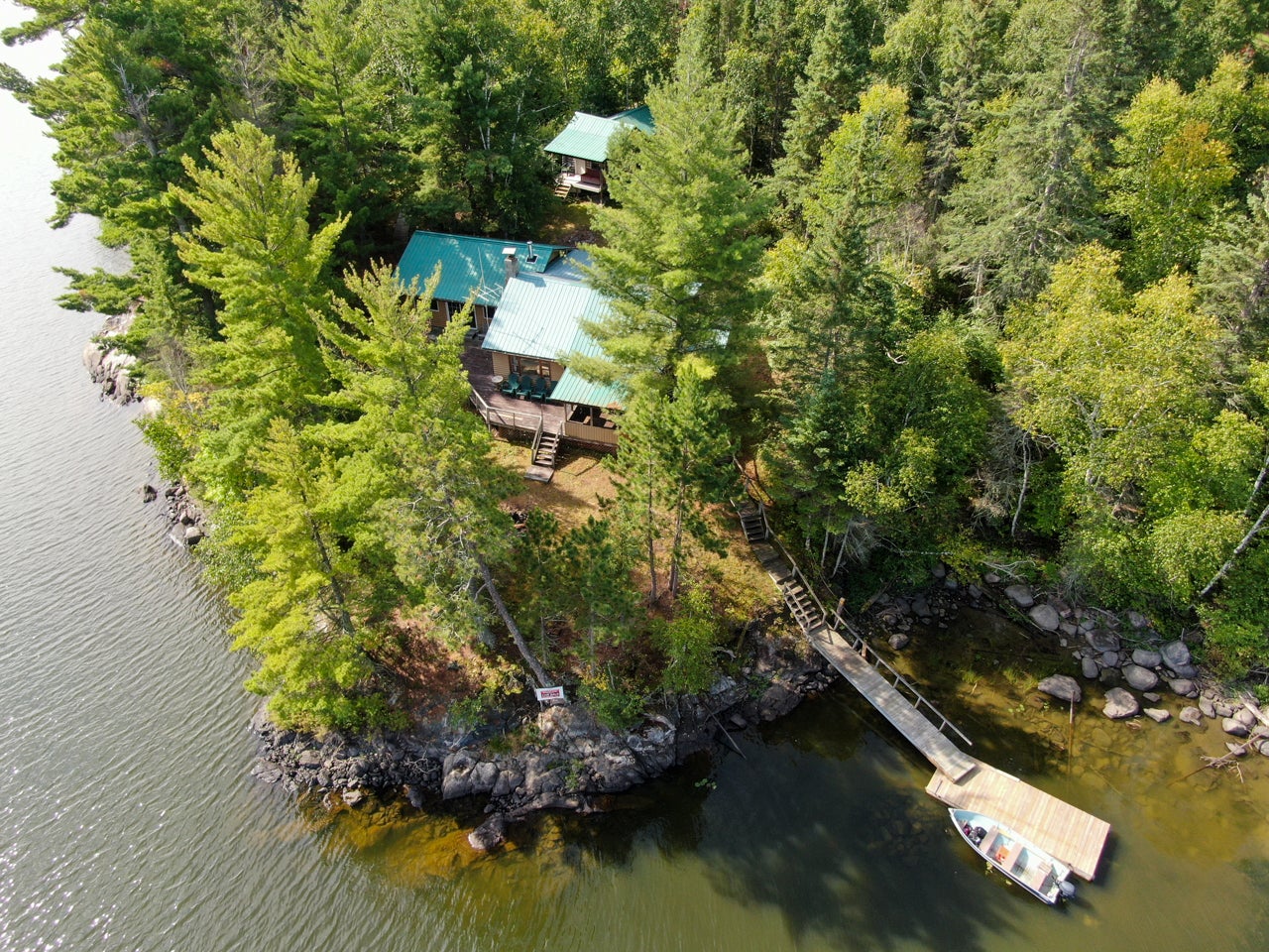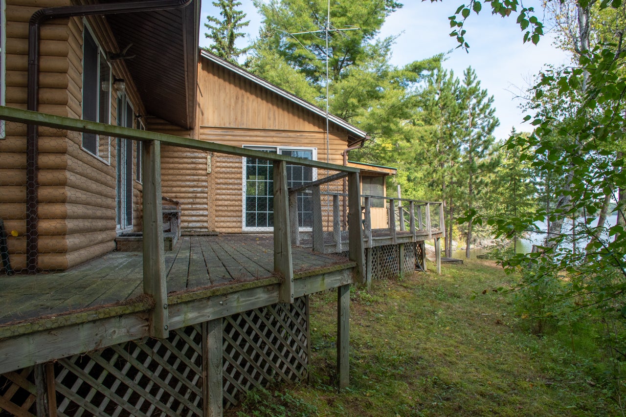 Cabin on Sabaskong Bay, Lake of the Woods. It's a nice setting, with the cabin situated close to the water's edge among some beautiful pine trees.