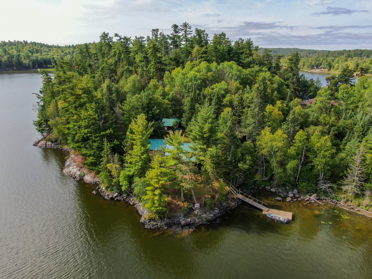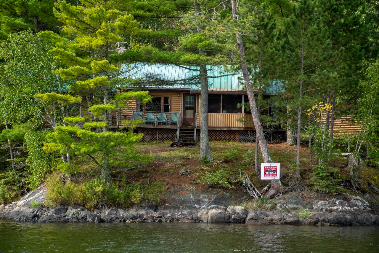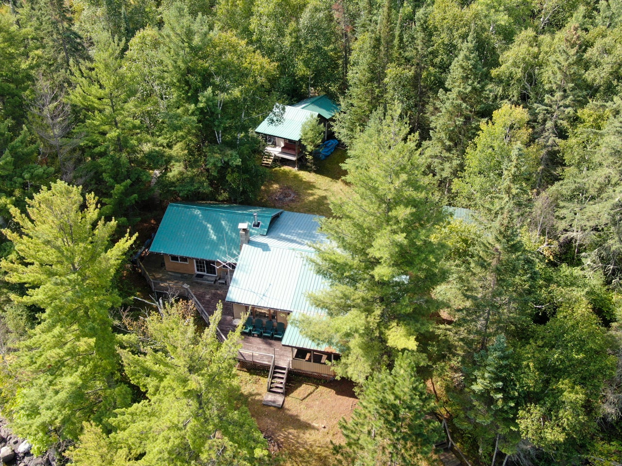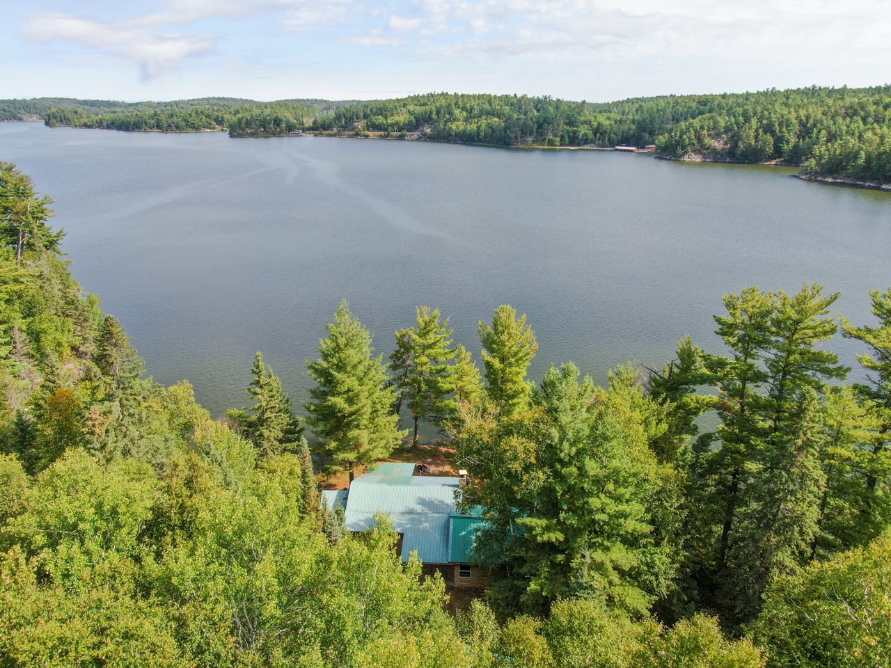 Cabin on Sabaskong Bay, Lake of the Woods. It's a nice setting, with the cabin situated close to the water's edge among some beautiful pine trees.