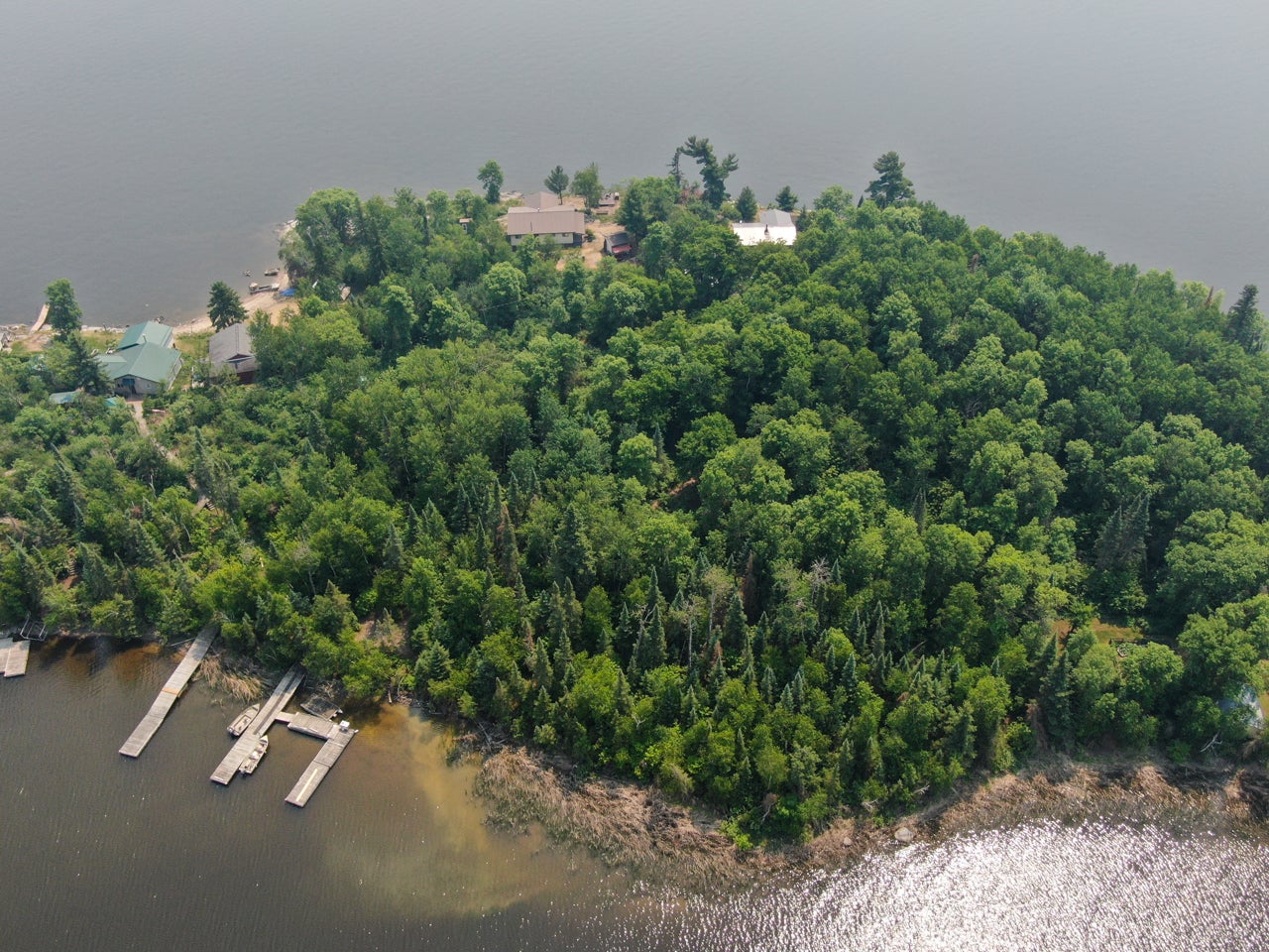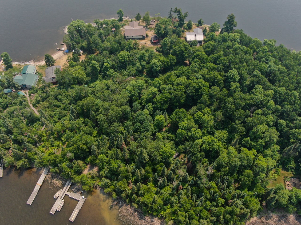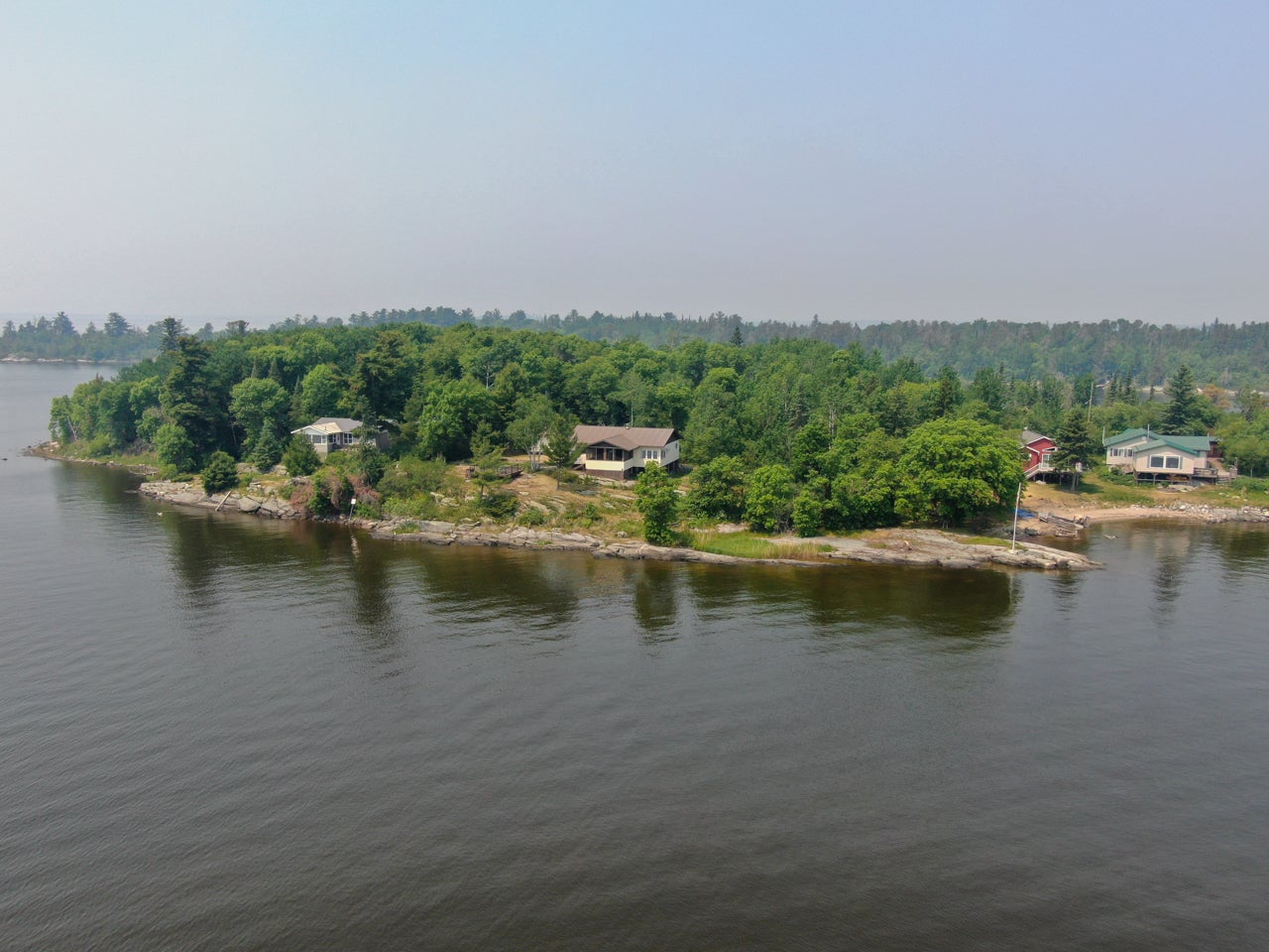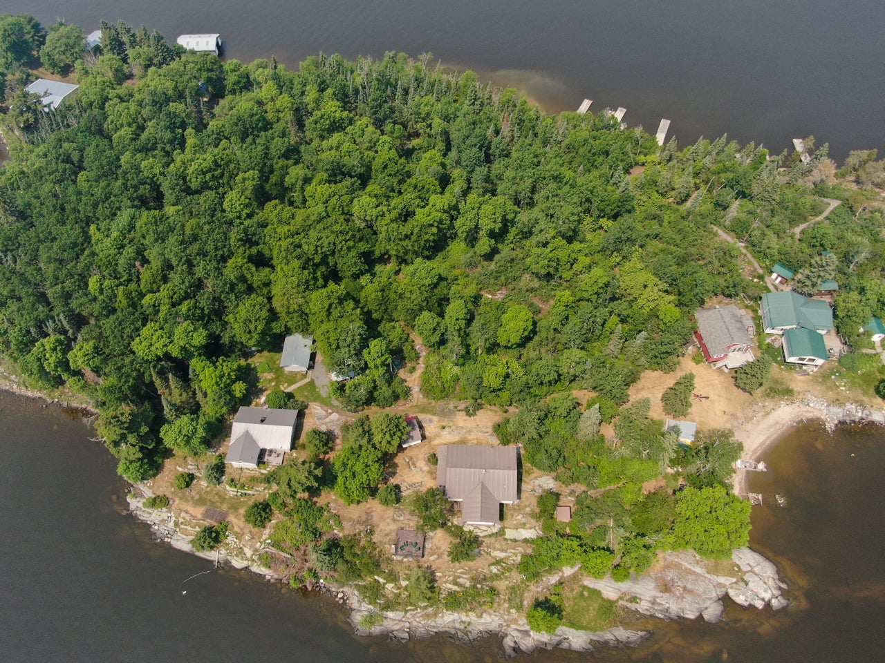 You own the cabin, fish-cleaning building, and storage shed/workshop outright and share a 1/4 interest in four acres of land. There is a shared dock on the north side of the island.
