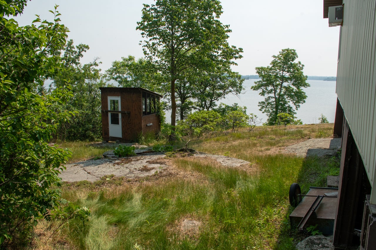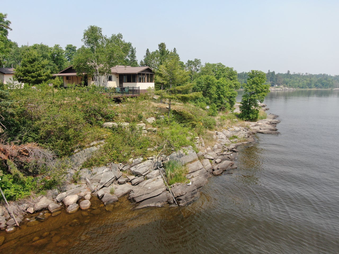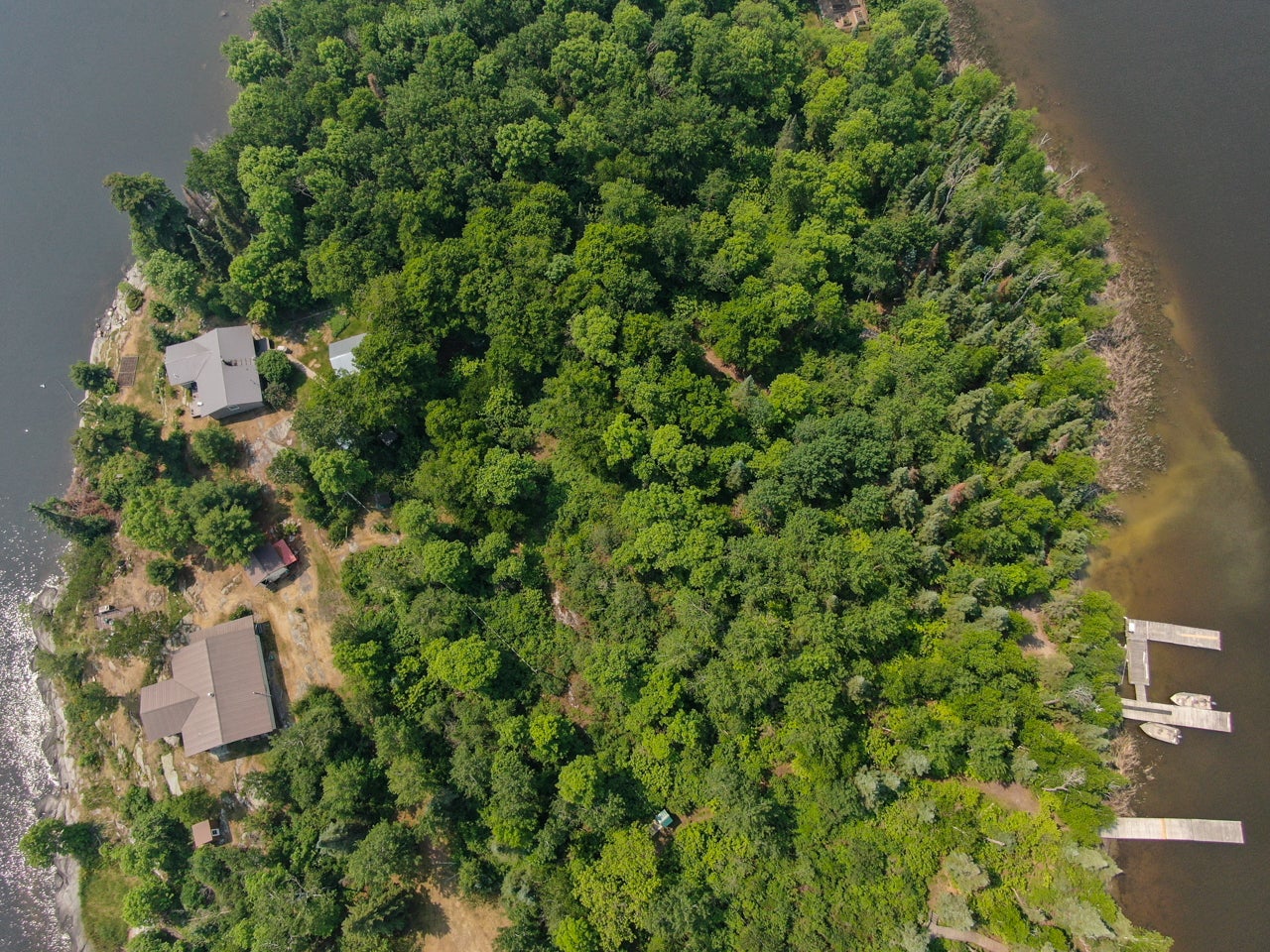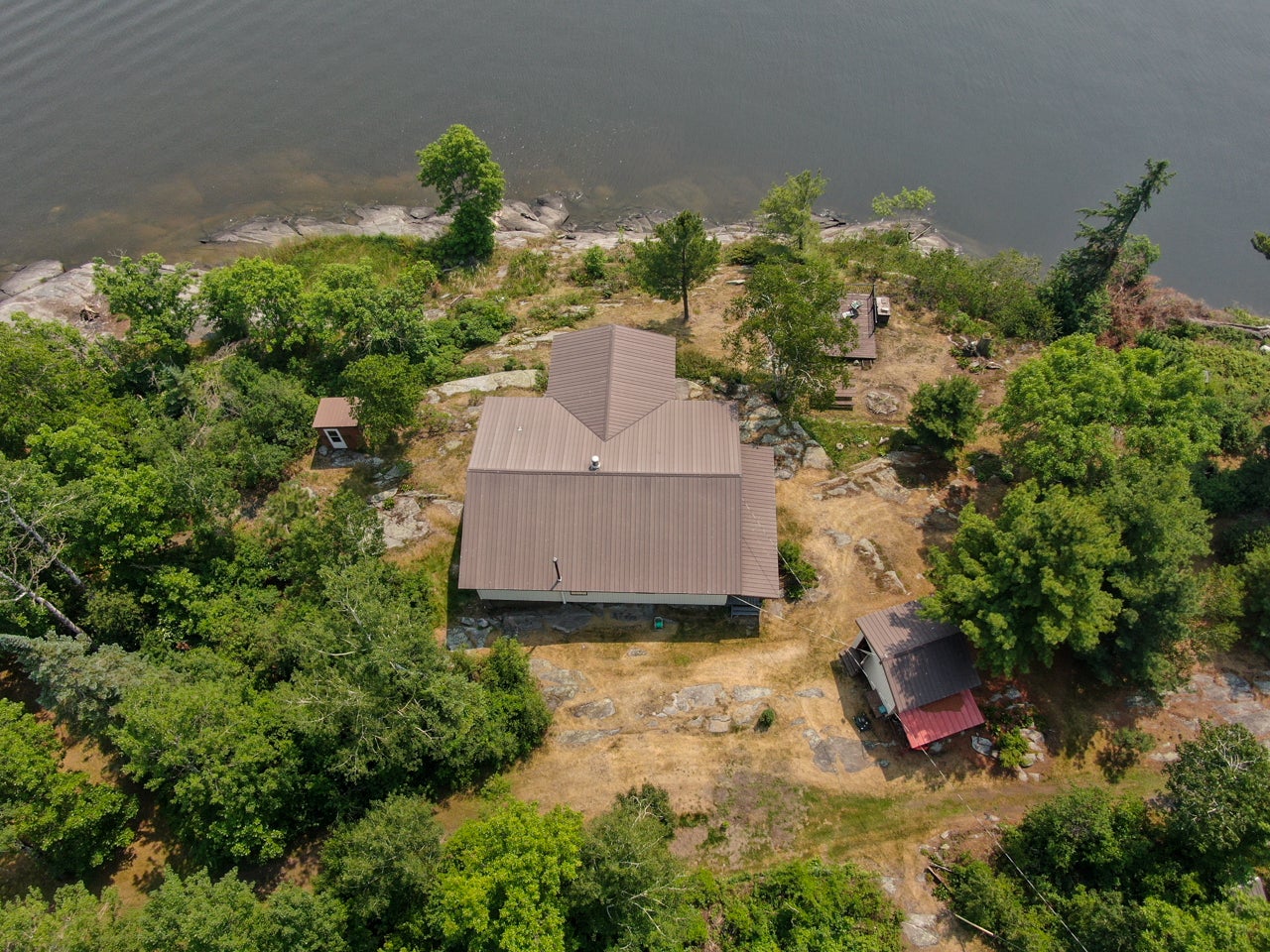 You own the cabin, fish-cleaning building, and storage shed/workshop outright and share a 1/4 interest in four acres of land. There is a shared dock on the north side of the island.