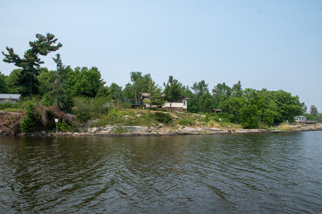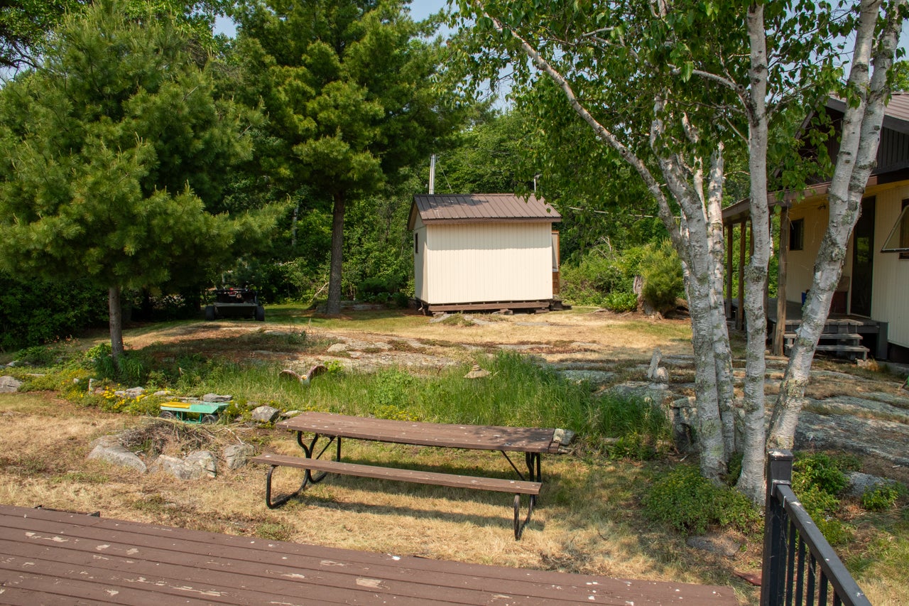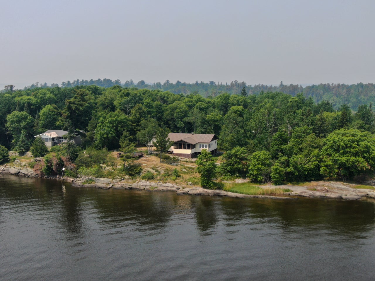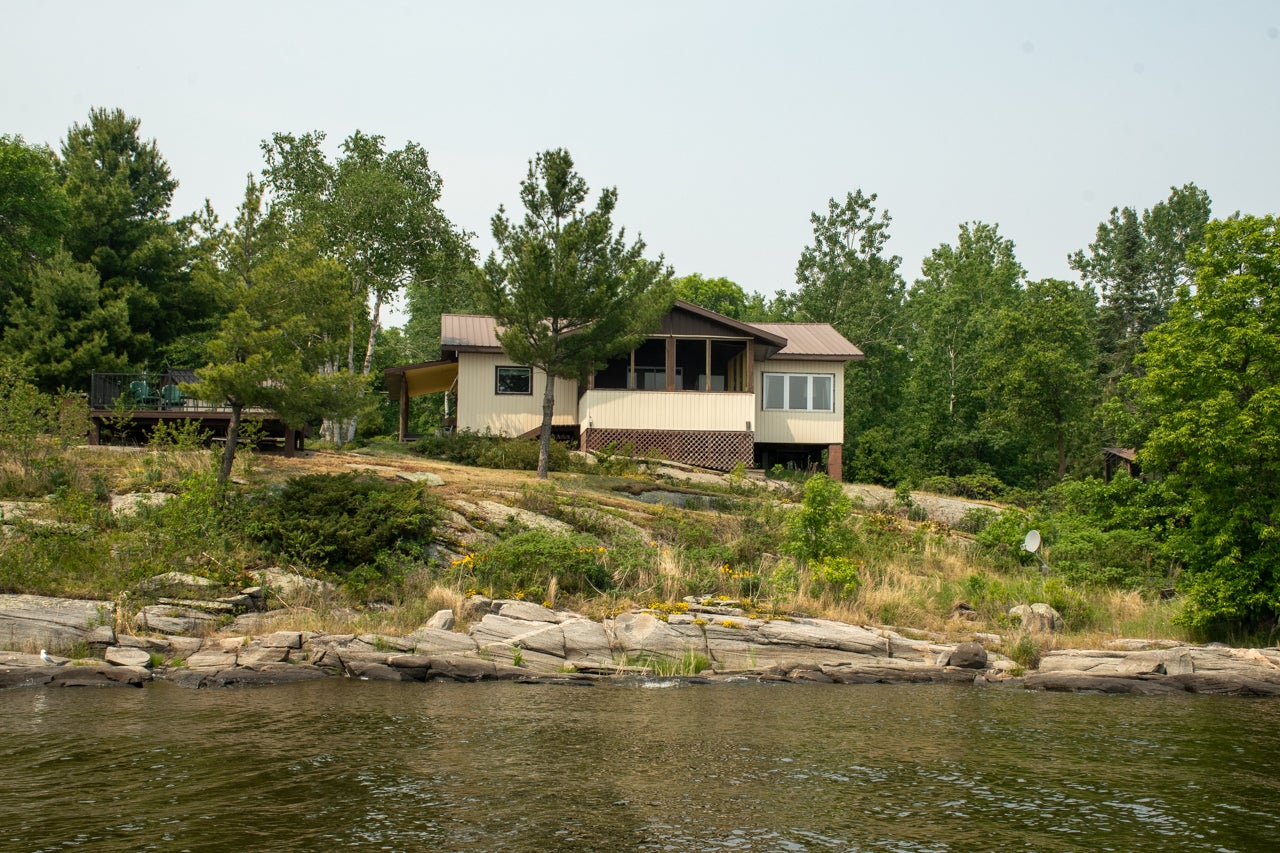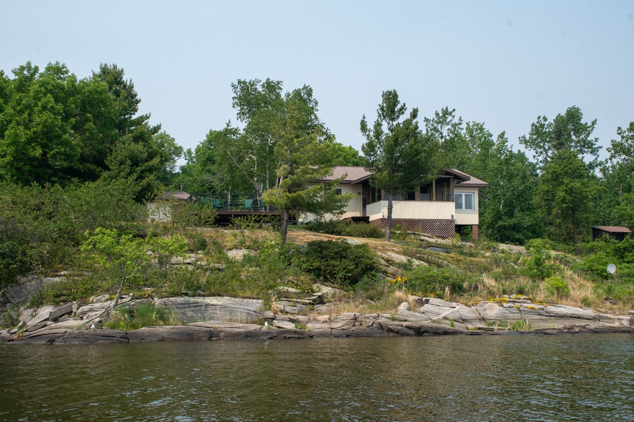 You own the cabin, fish-cleaning building, and storage shed/workshop outright and share a 1/4 interest in four acres of land. There is a shared dock on the north side of the island.