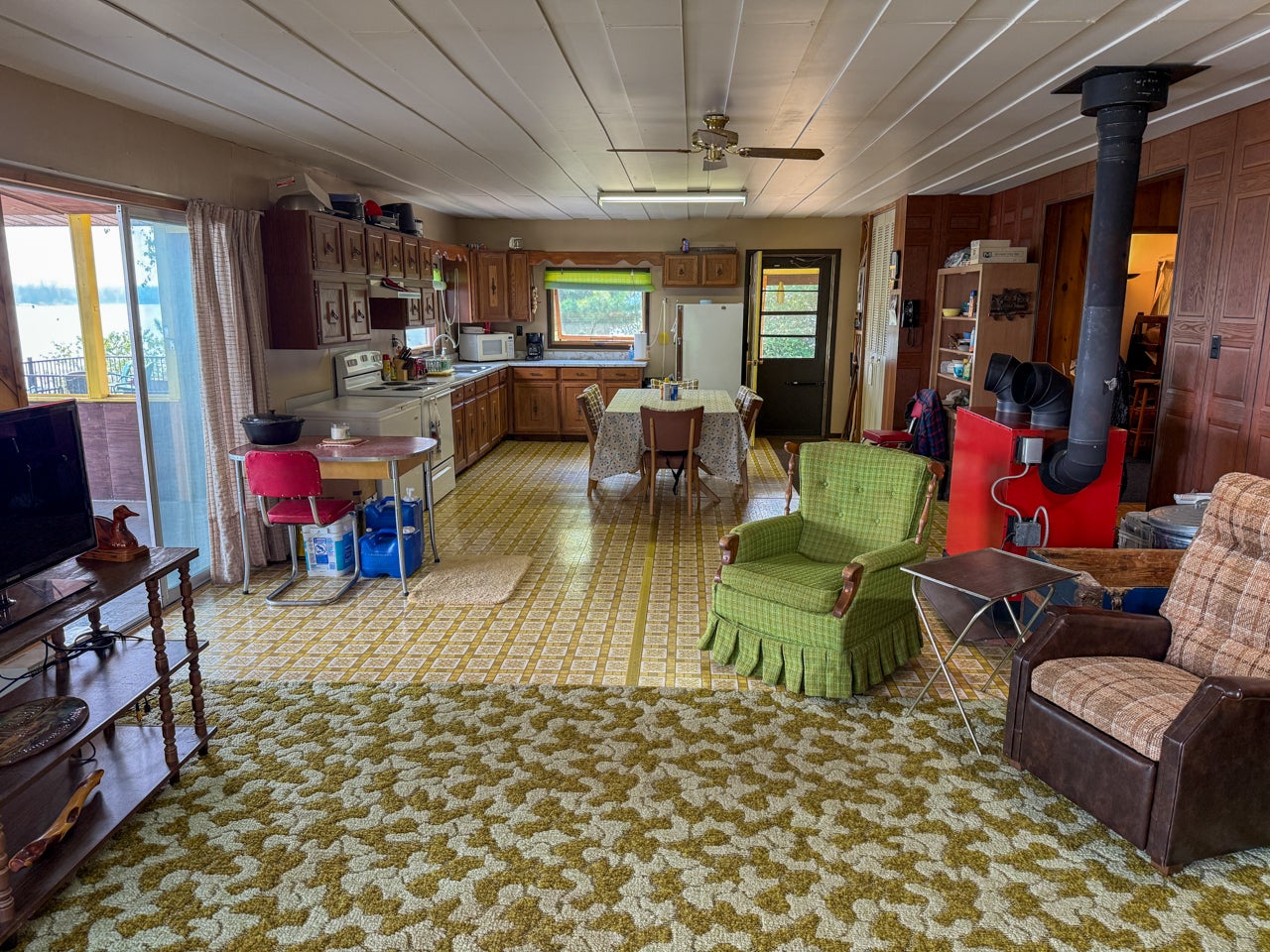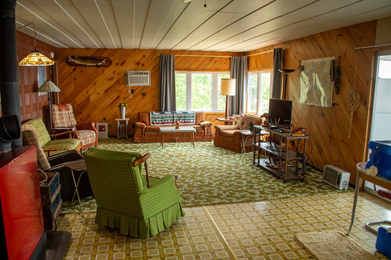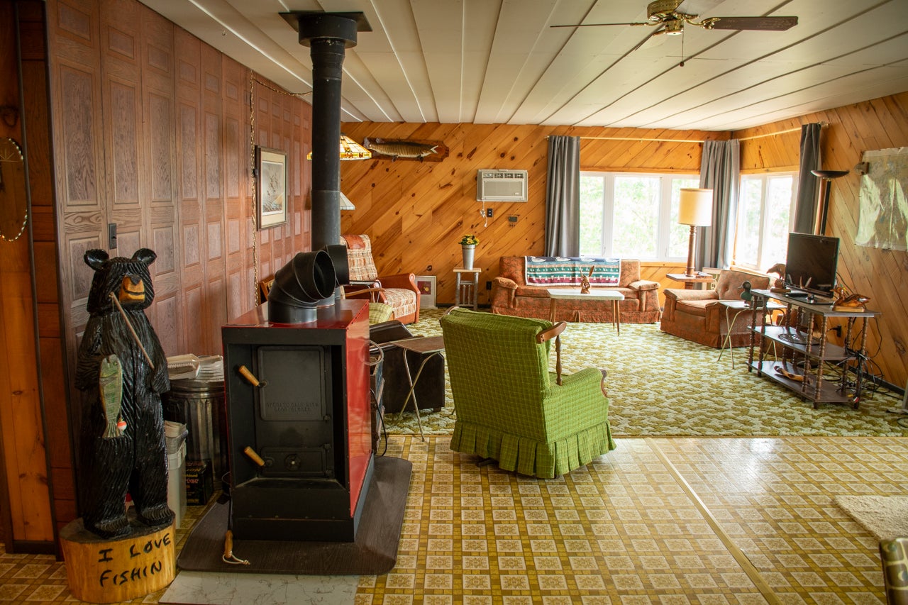 Services include: 100 amp electrical panel, water is drawn from the lake with a submersible pump, heat is provided by a wood-burning stove (not WETT inspected), and an outdoor privy.