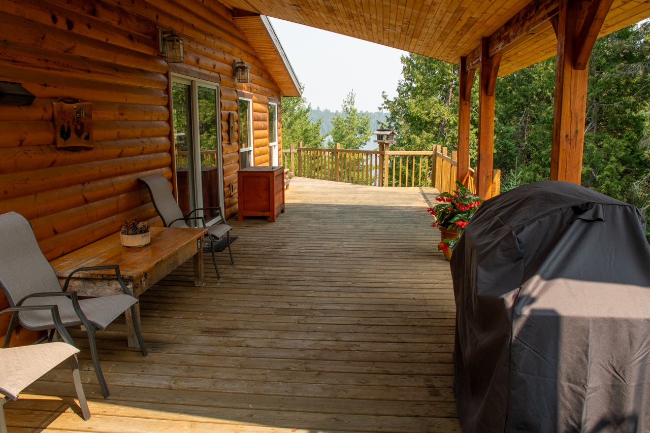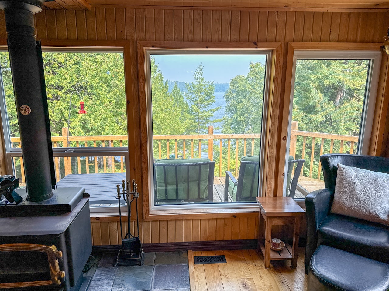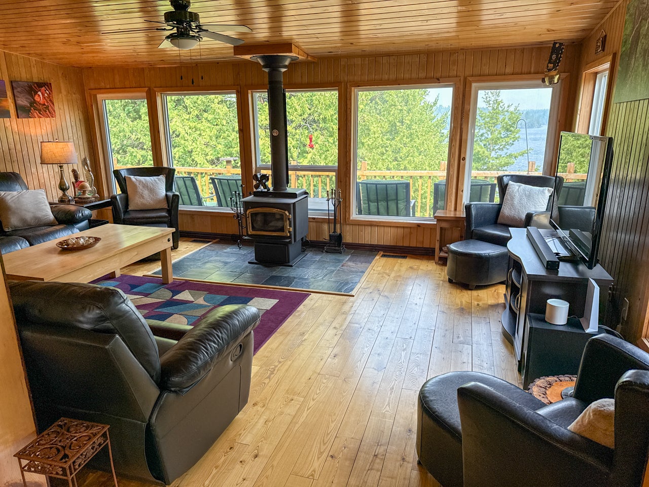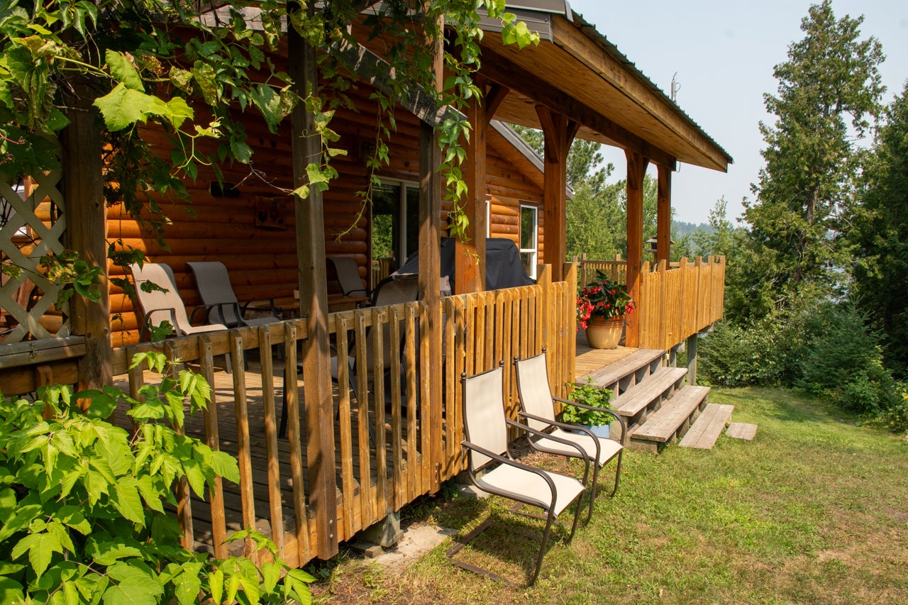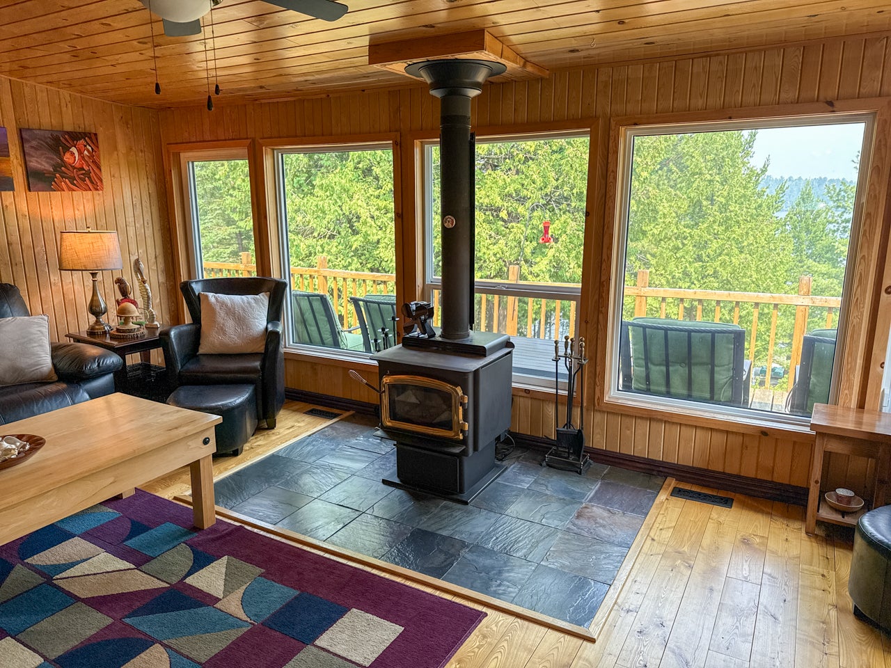 The 1,288 sq. ft. main floor offers an open-concept kitchen, dining, and living area with a primary bedroom and a spa-style bath with a jacuzzi tub and separate shower. Upstairs, two additional bedrooms, an office and a second full bathroom provide plenty of space for family or guests. Finishes include ash flooring, knotty pine and both bathrooms are finished with cedar. A large deck wraps the north and east sides, with a covered section perfect for morning coffee or evening wind-downs.