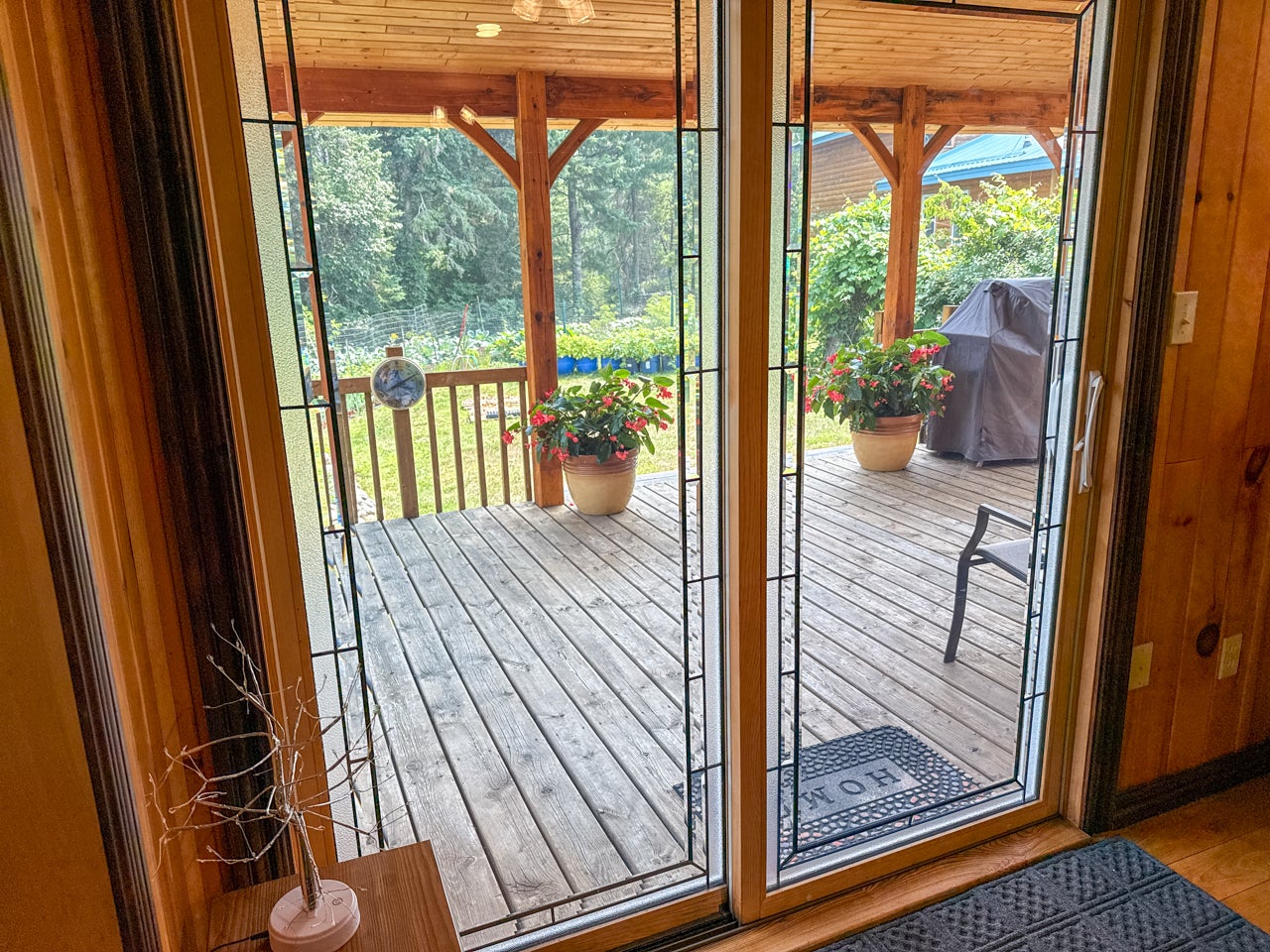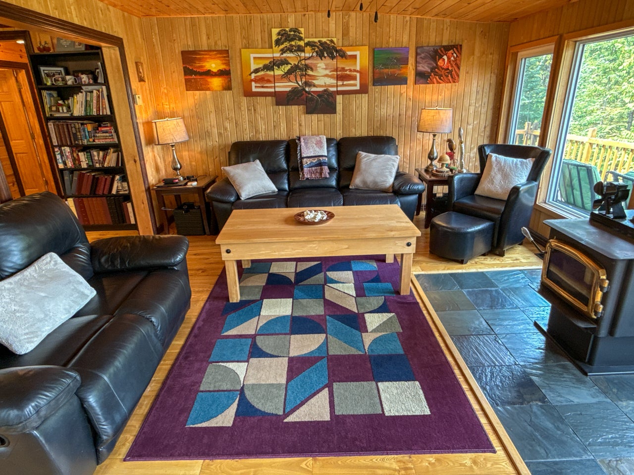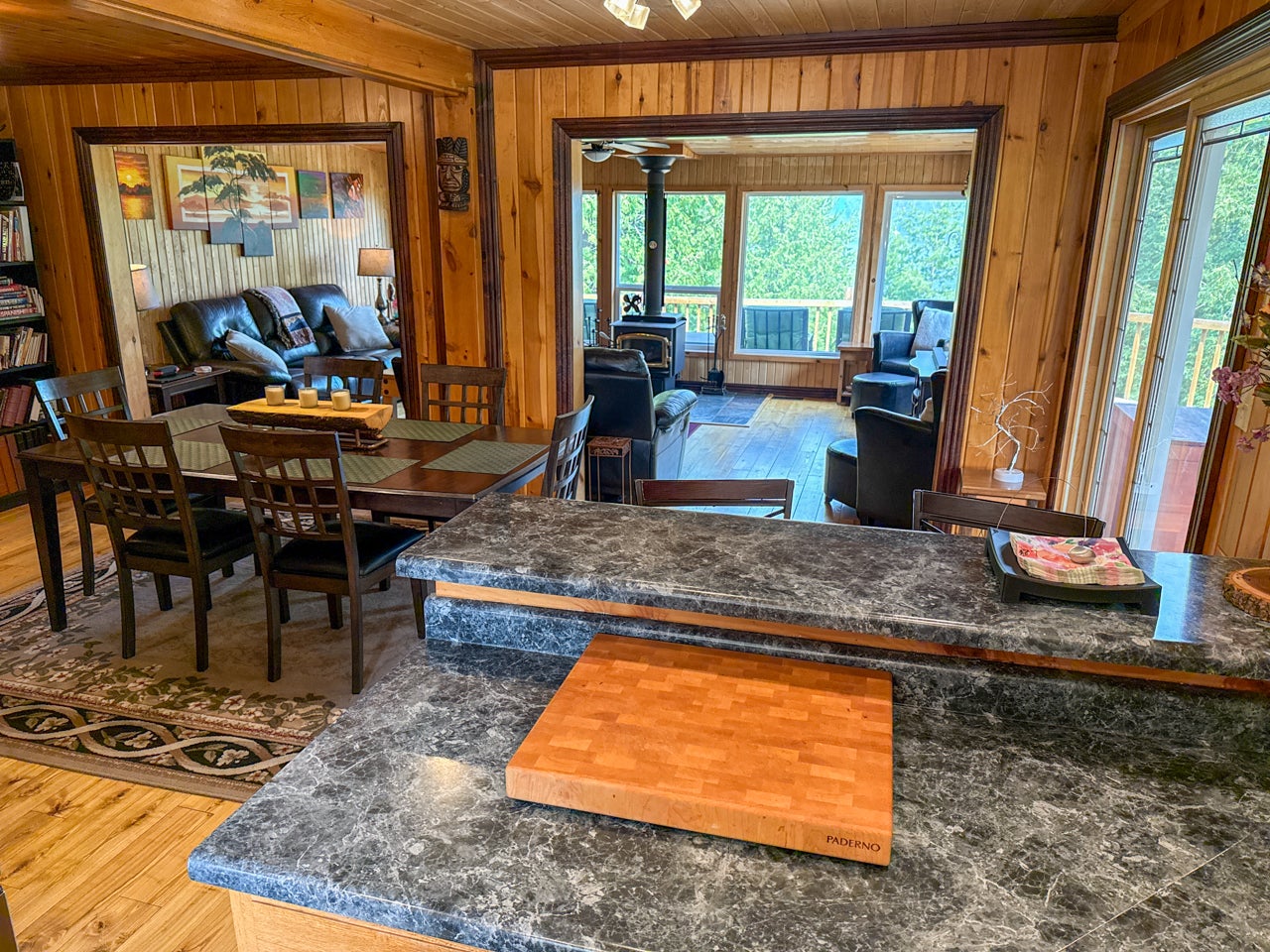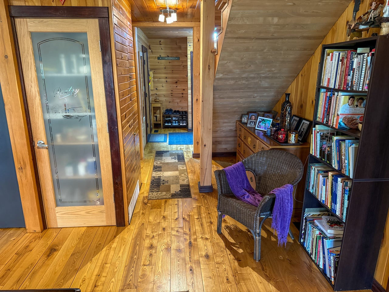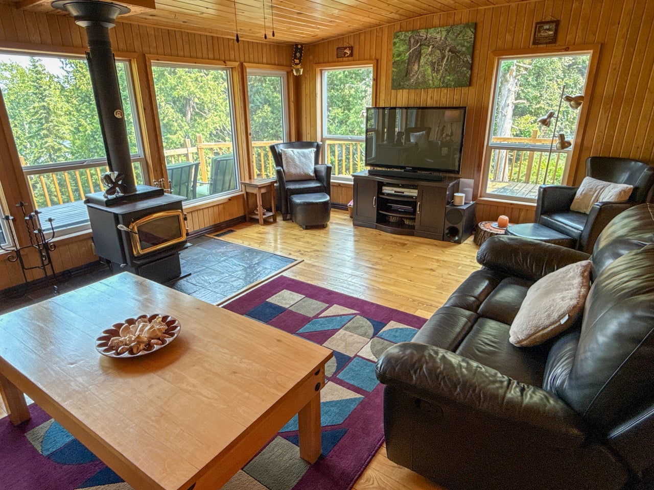 The 1,288 sq. ft. main floor offers an open-concept kitchen, dining, and living area with a primary bedroom and a spa-style bath with a jacuzzi tub and separate shower. Upstairs, two additional bedrooms, an office and a second full bathroom provide plenty of space for family or guests. Finishes include ash flooring, knotty pine and both bathrooms are finished with cedar. A large deck wraps the north and east sides, with a covered section perfect for morning coffee or evening wind-downs.