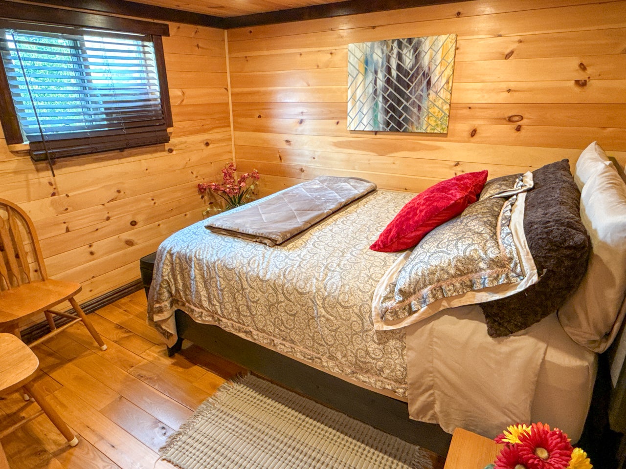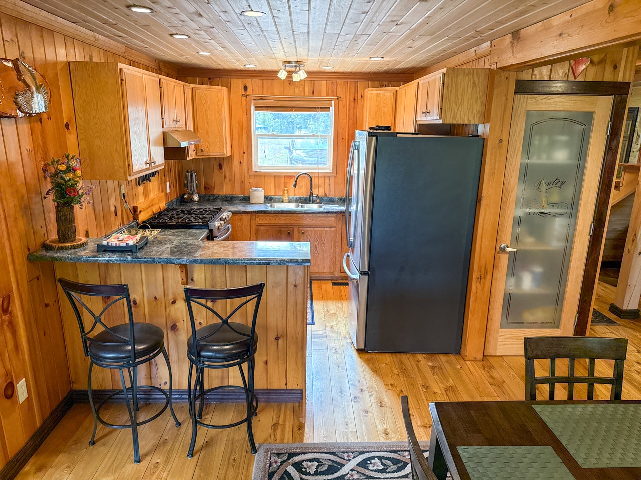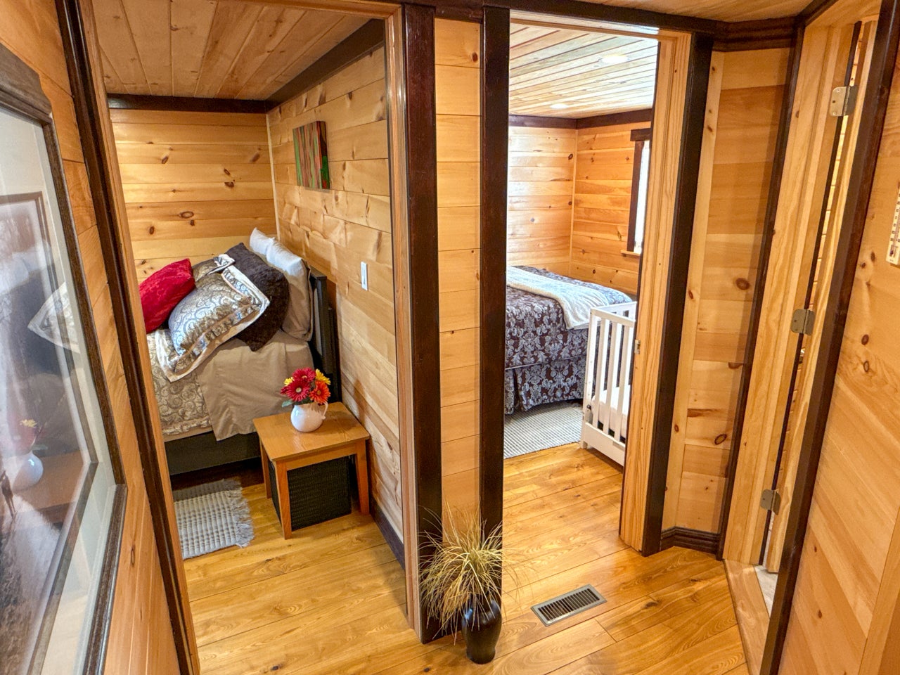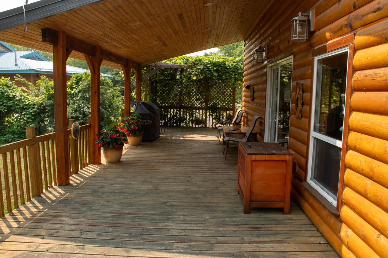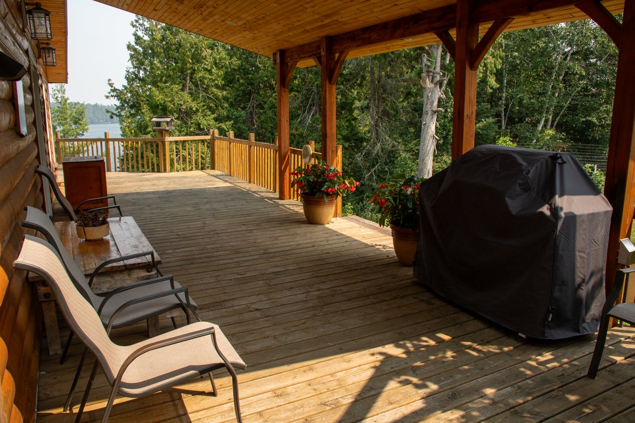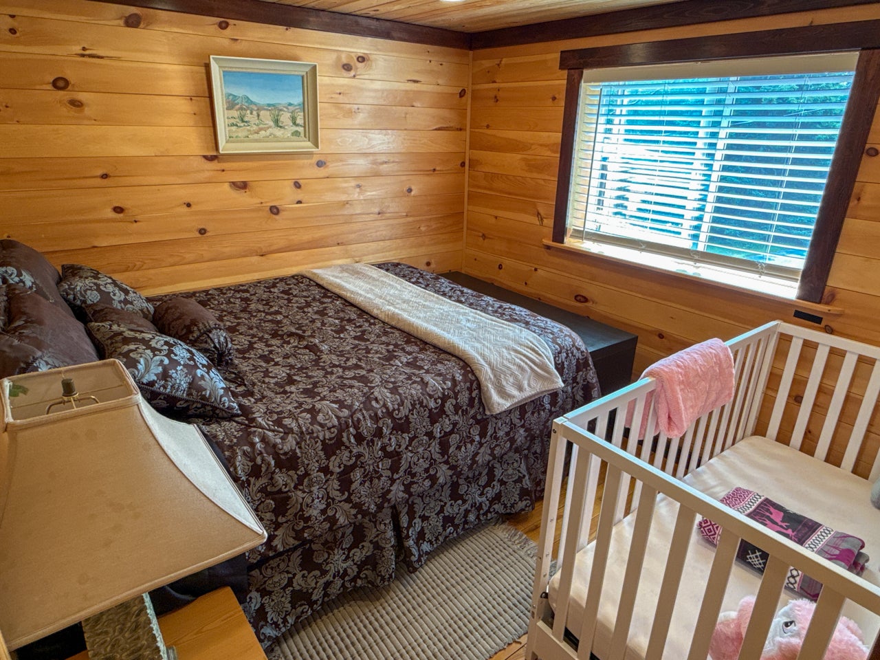 The 1,288 sq. ft. main floor offers an open-concept kitchen, dining, and living area with a primary bedroom and a spa-style bath with a jacuzzi tub and separate shower. Upstairs, two additional bedrooms, an office and a second full bathroom provide plenty of space for family or guests. Finishes include ash flooring, knotty pine and both bathrooms are finished with cedar. A large deck wraps the north and east sides, with a covered section perfect for morning coffee or evening wind-downs.