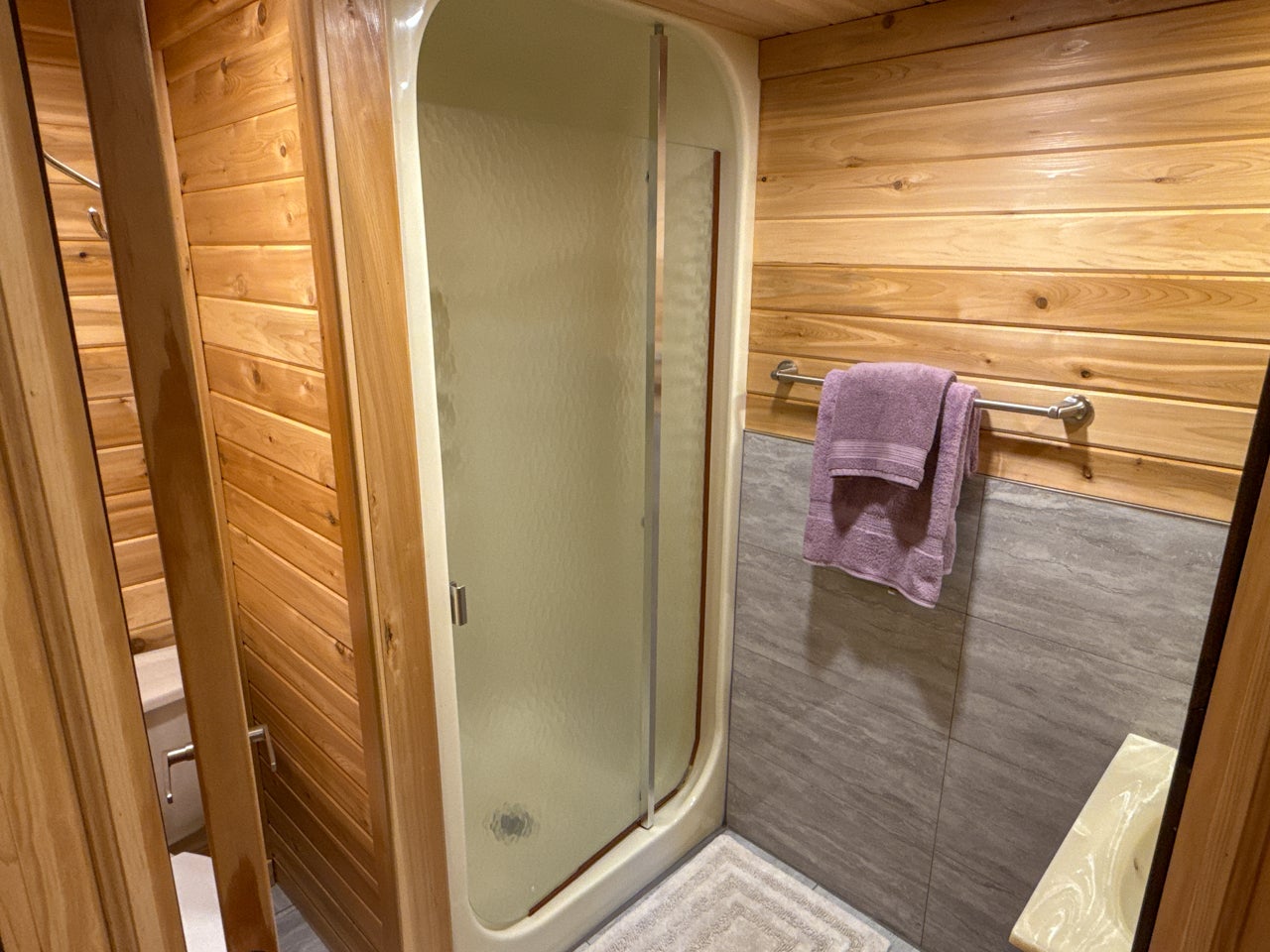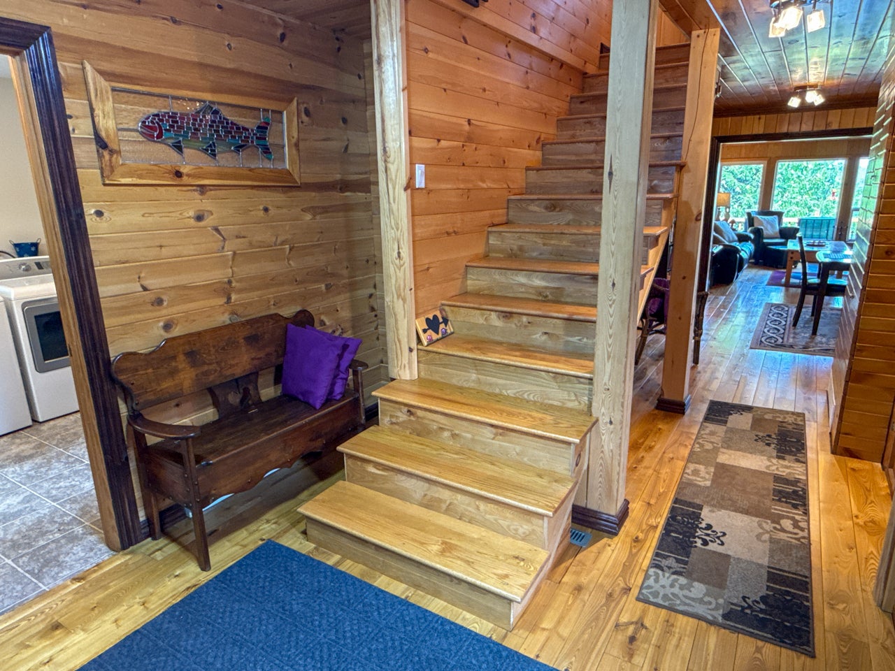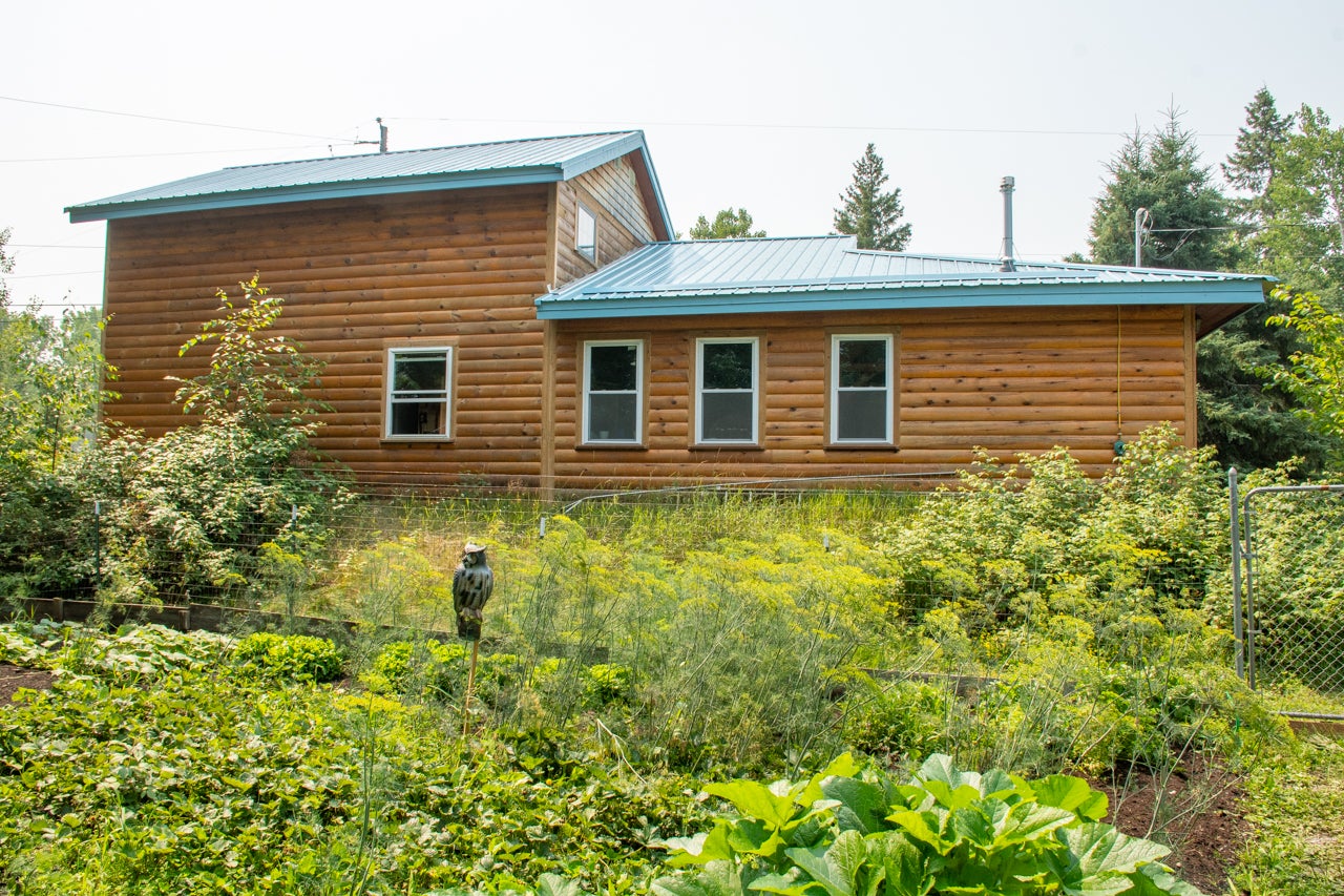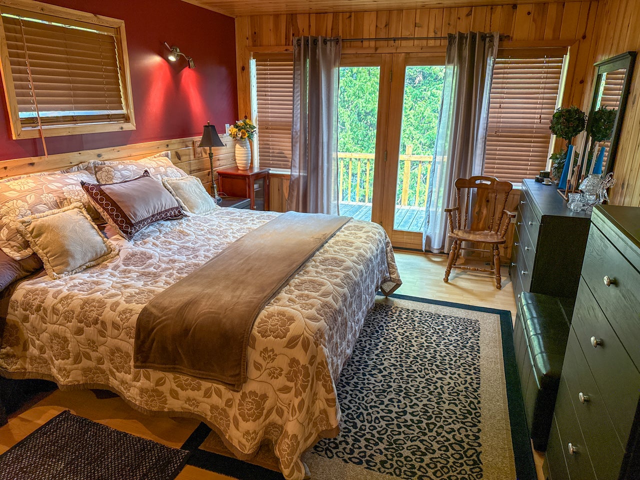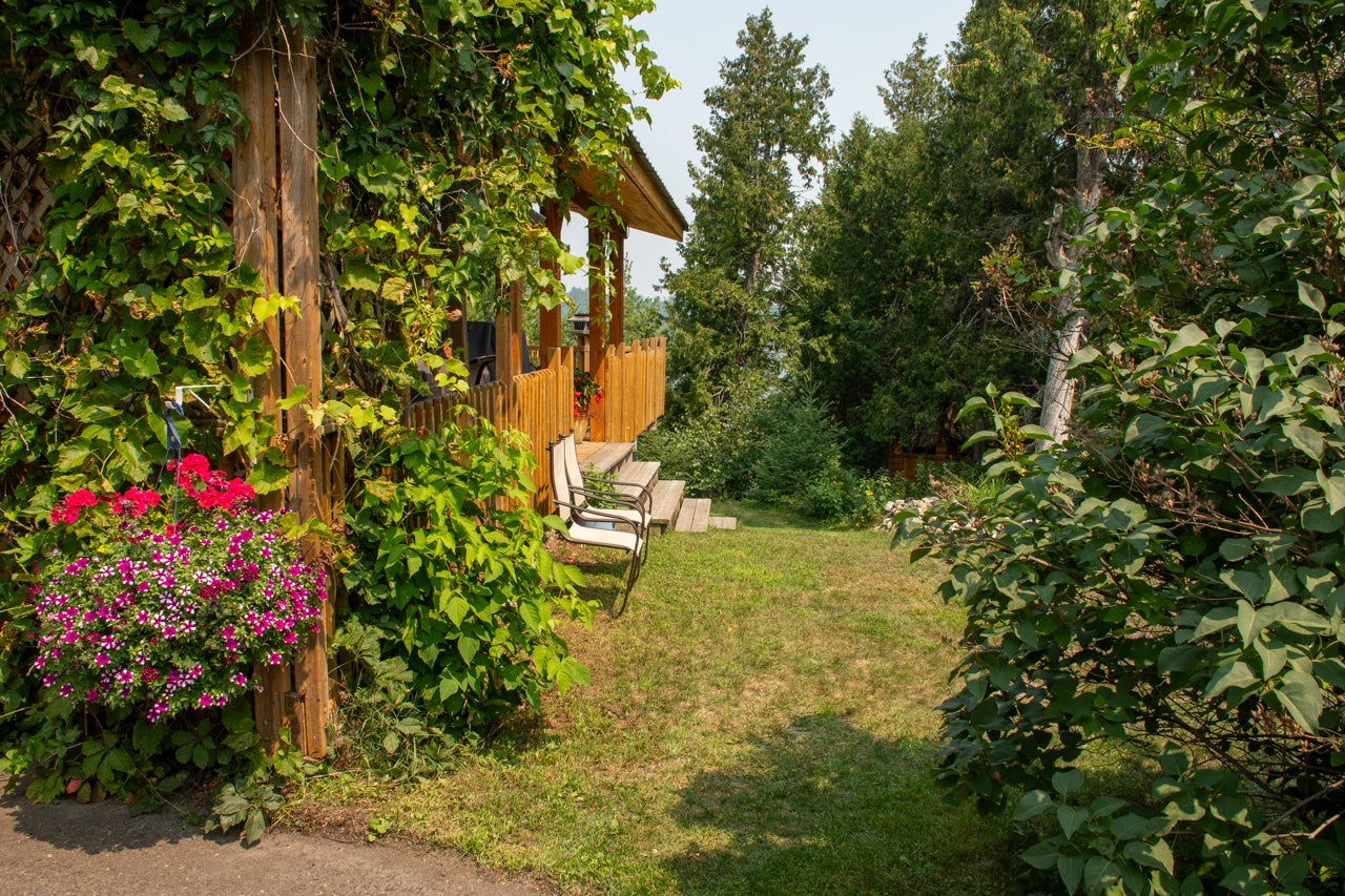 The 1,288 sq. ft. main floor offers an open-concept kitchen, dining, and living area with a primary bedroom and a spa-style bath with a jacuzzi tub and separate shower. Upstairs, two additional bedrooms, an office and a second full bathroom provide plenty of space for family or guests. Finishes include ash flooring, knotty pine and both bathrooms are finished with cedar. A large deck wraps the north and east sides, with a covered section perfect for morning coffee or evening wind-downs.