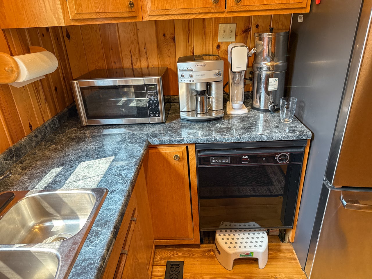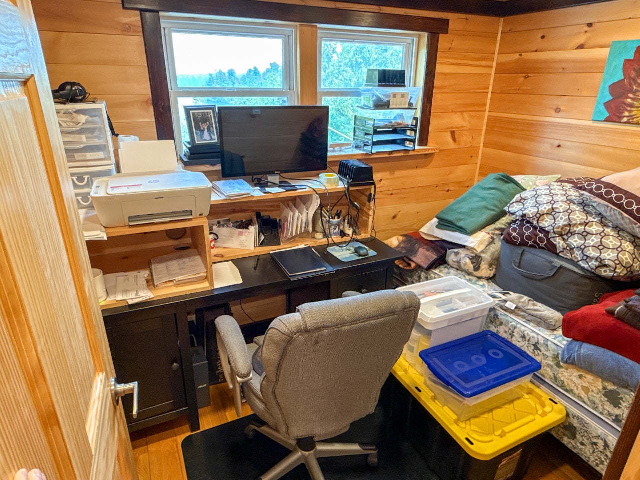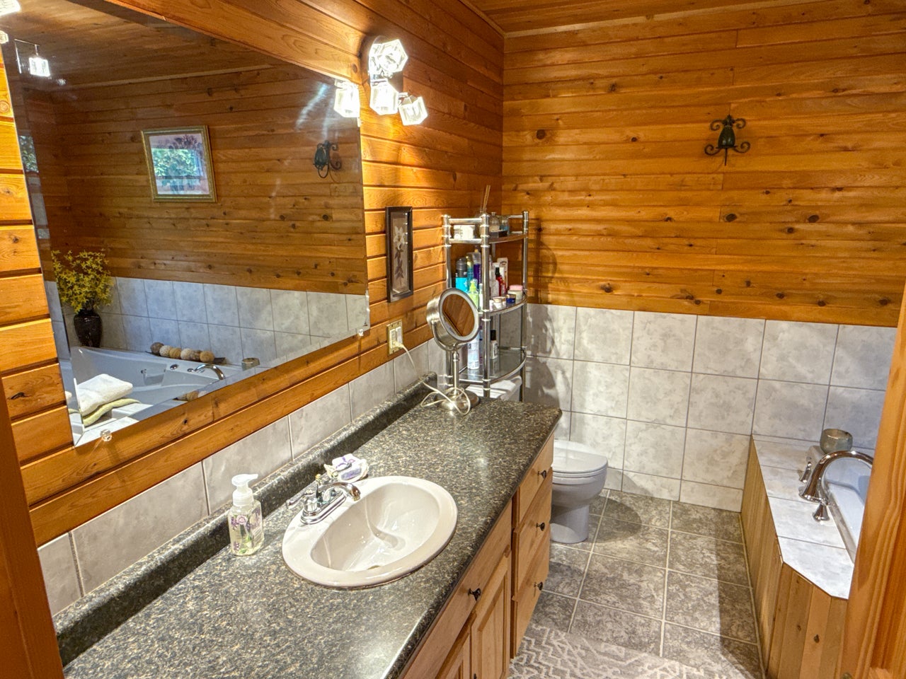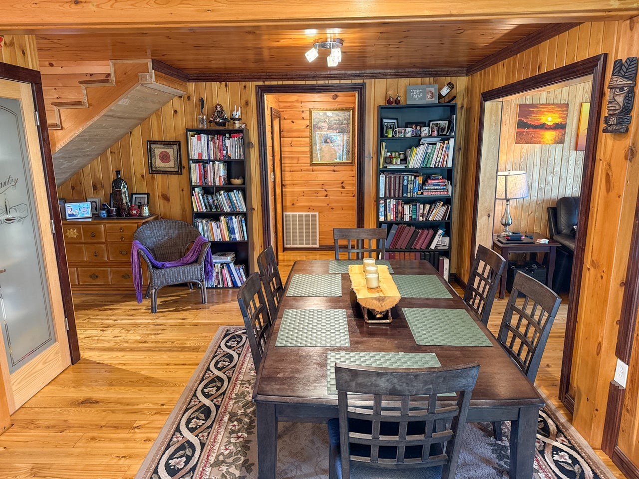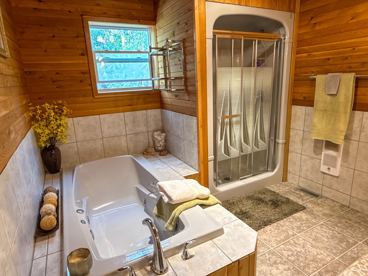 The 1,288 sq. ft. main floor offers an open-concept kitchen, dining, and living area with a primary bedroom and a spa-style bath with a jacuzzi tub and separate shower. Upstairs, two additional bedrooms, an office and a second full bathroom provide plenty of space for family or guests. Finishes include ash flooring, knotty pine and both bathrooms are finished with cedar. A large deck wraps the north and east sides, with a covered section perfect for morning coffee or evening wind-downs.