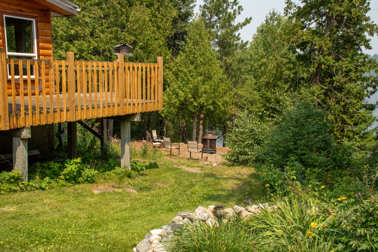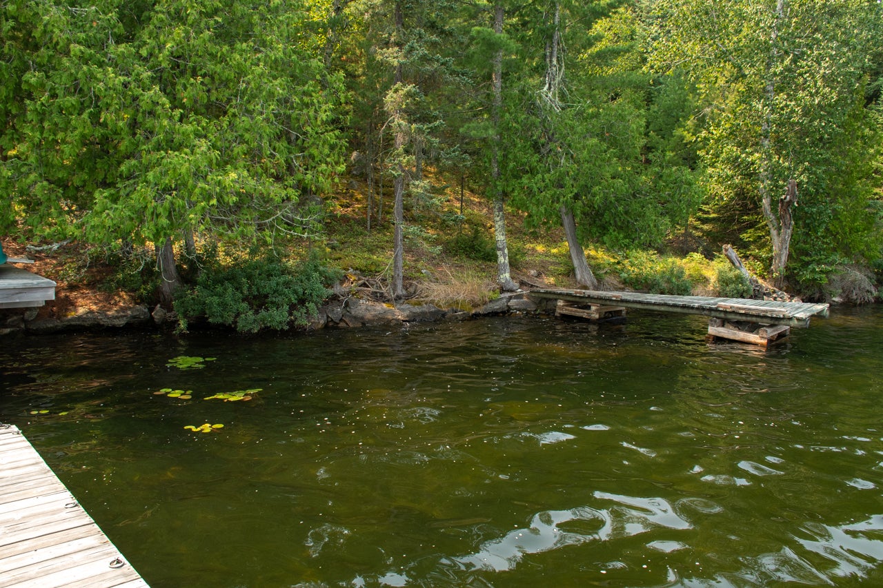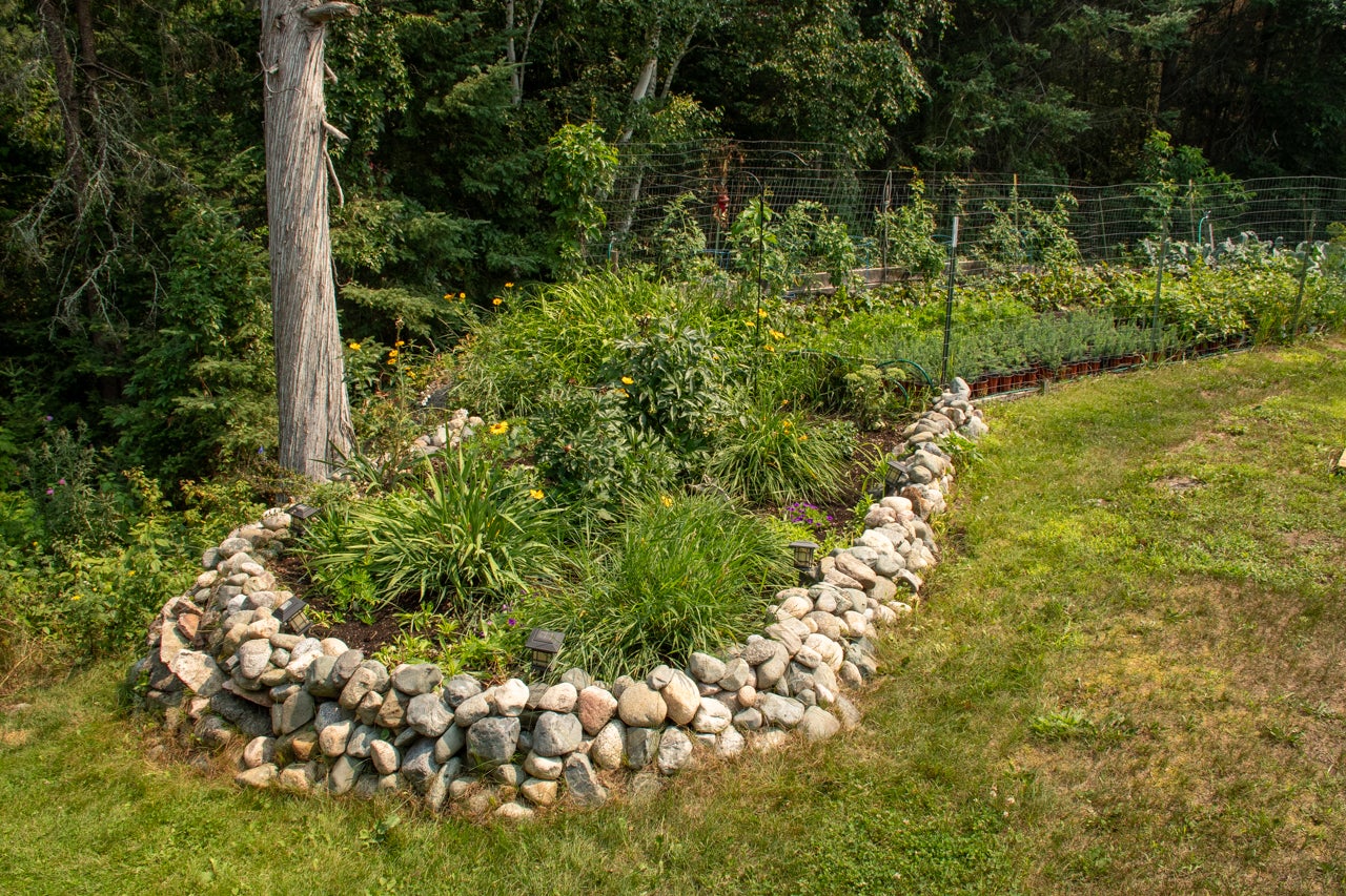Set on 0.78 acres with 190 feet of rocky shoreline and mature trees, the property offers a classic setting: mature white pines, cedar, a landscaped firepit area, and a large fenced-in garden. The north-facing shoreline has deep water off the dock and peaceful views across the bay.