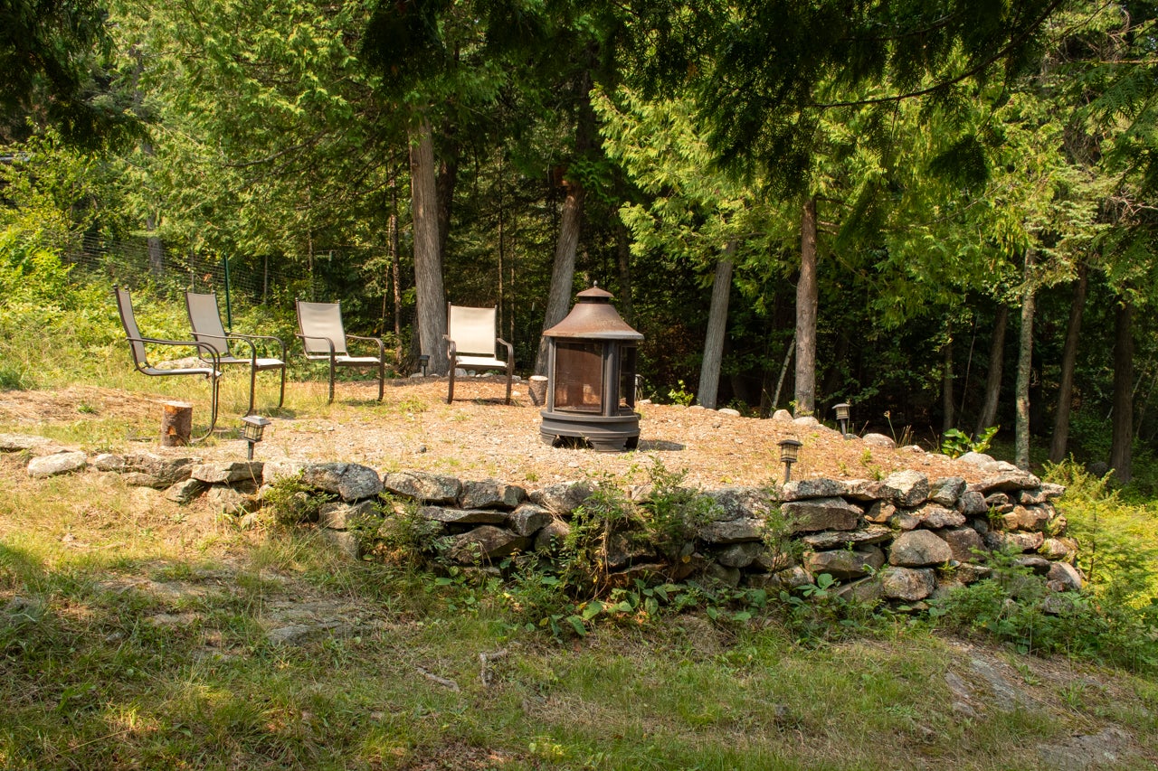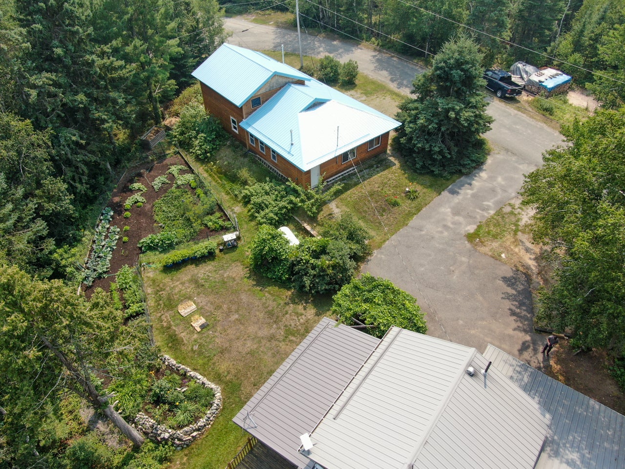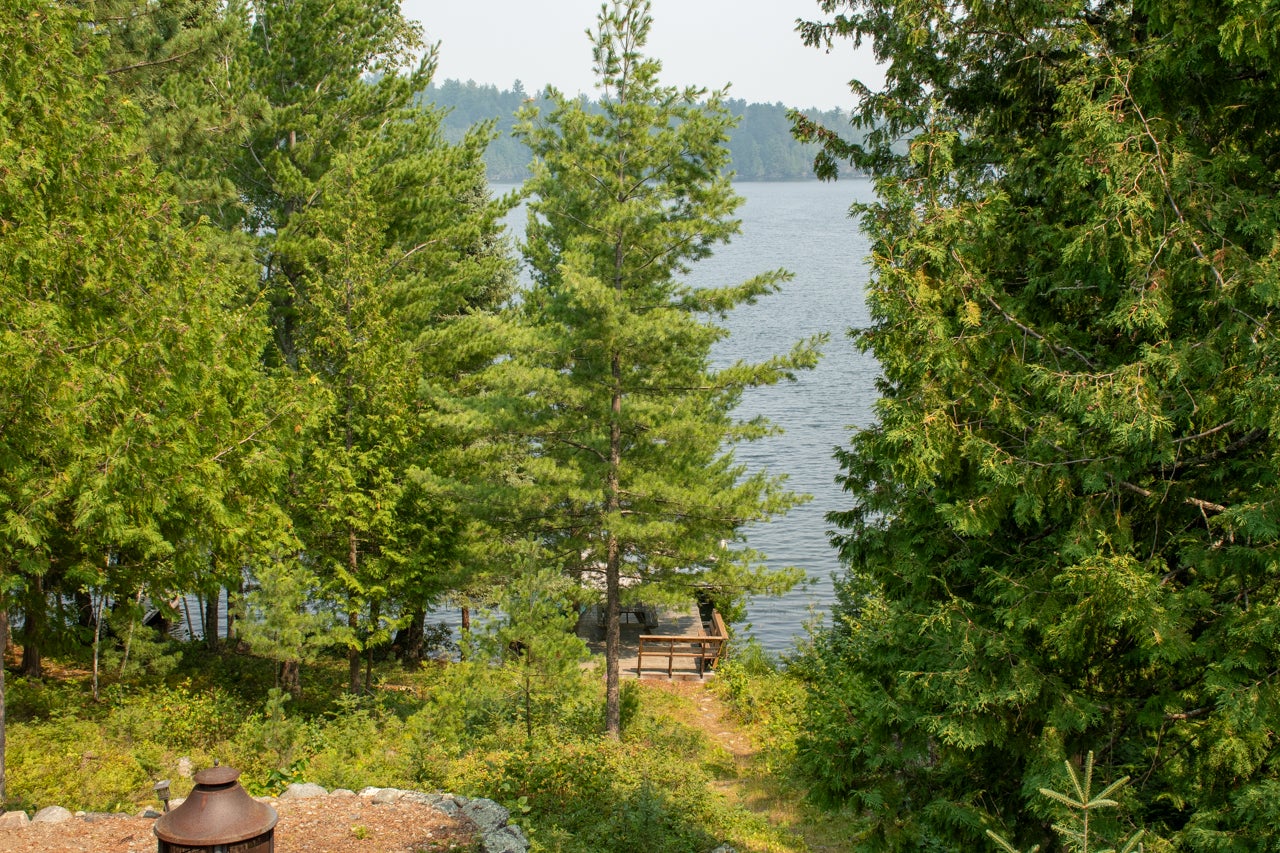 Set on 0.78 acres with 190 feet of rocky shoreline and mature trees, the property offers a classic setting: mature white pines, cedar, a landscaped firepit area, and a large fenced-in garden. The north-facing shoreline has deep water off the dock and peaceful views across the bay.