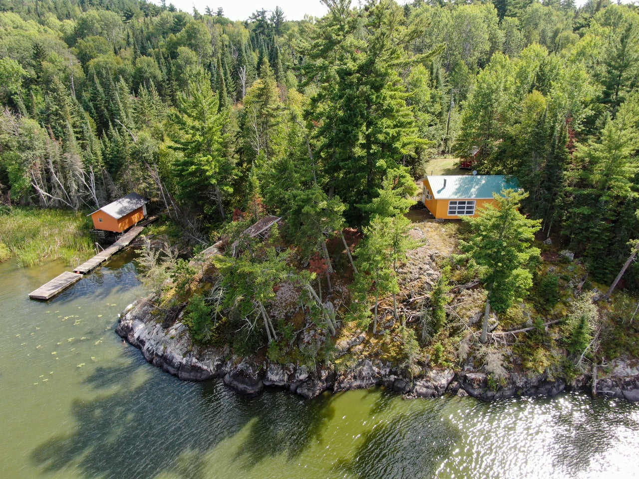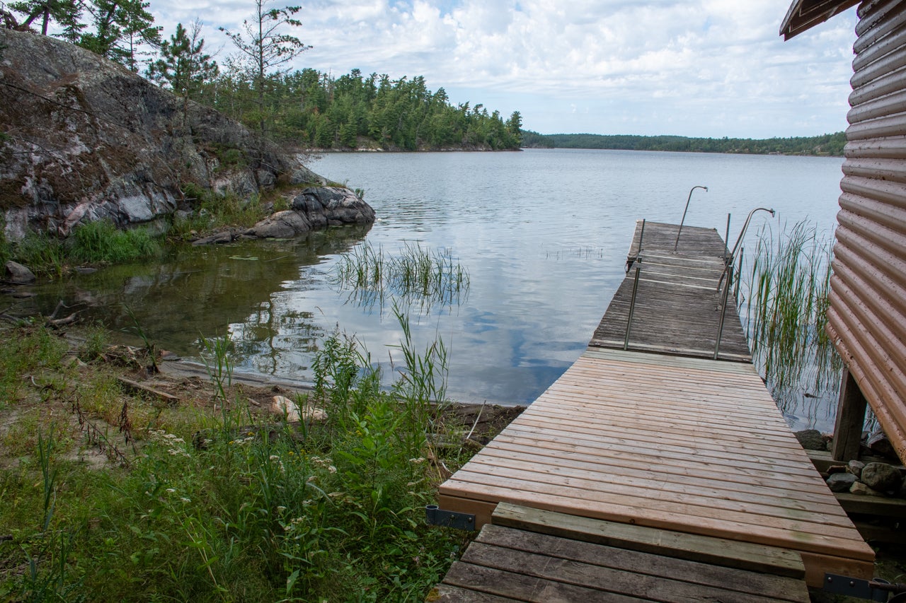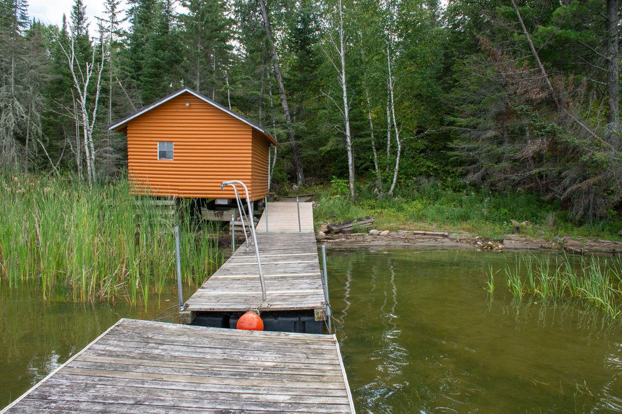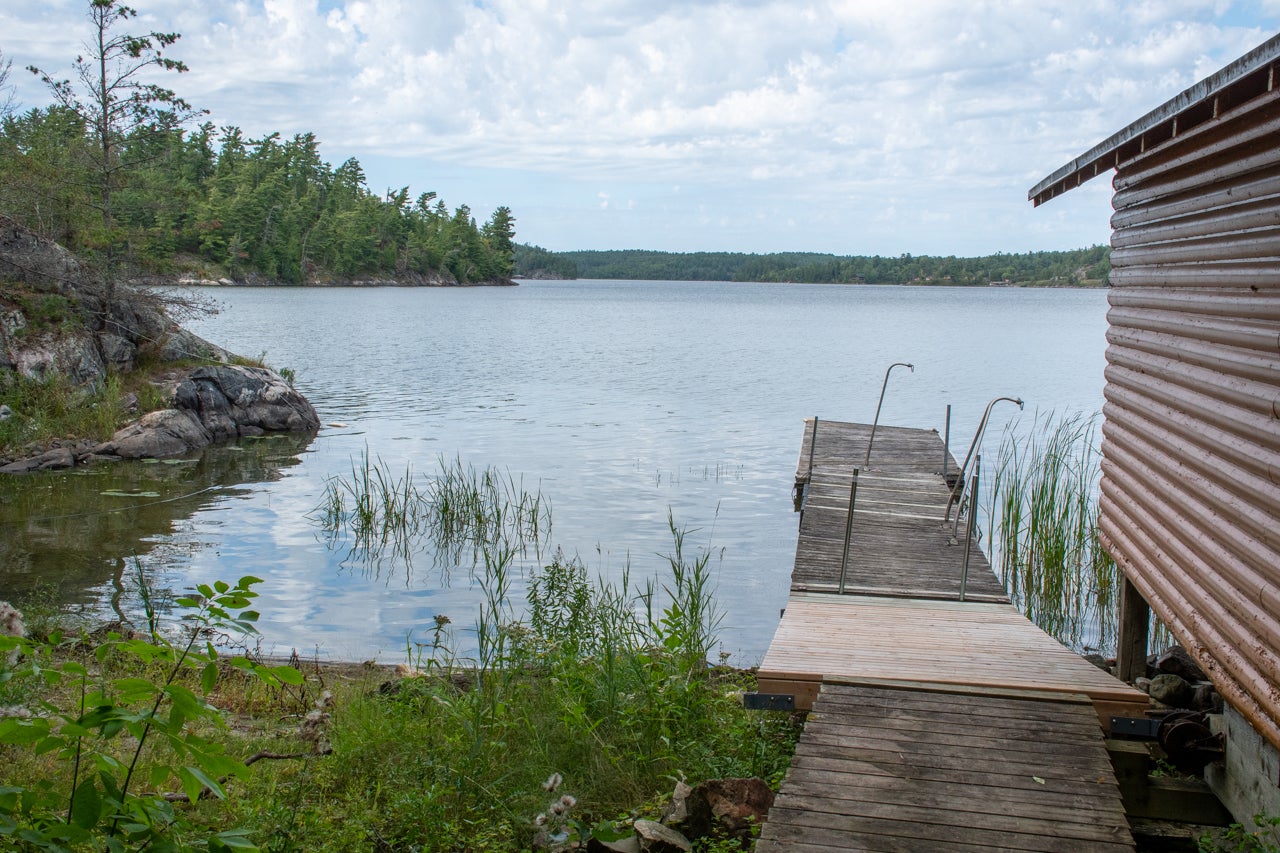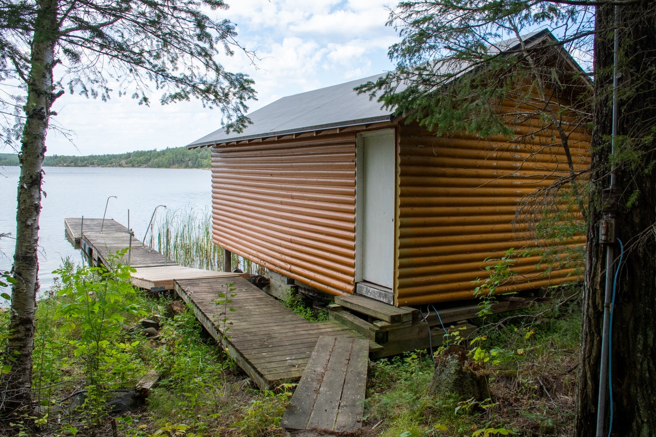 Crown Land to the west enhances the sense of seclusion, and a trail leads down from the cabin to the docking area. A small pump house/tool shed sits along the trail. At the water’s edge, a dry-land storage building/boathouse built on cribs is paired with a dock.