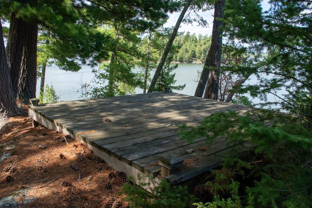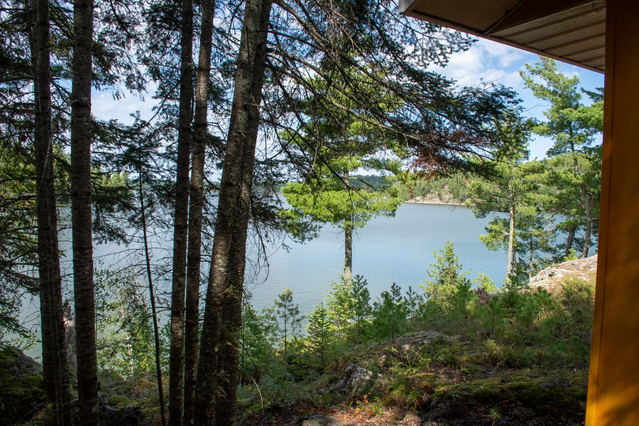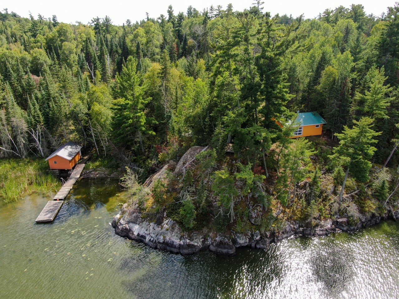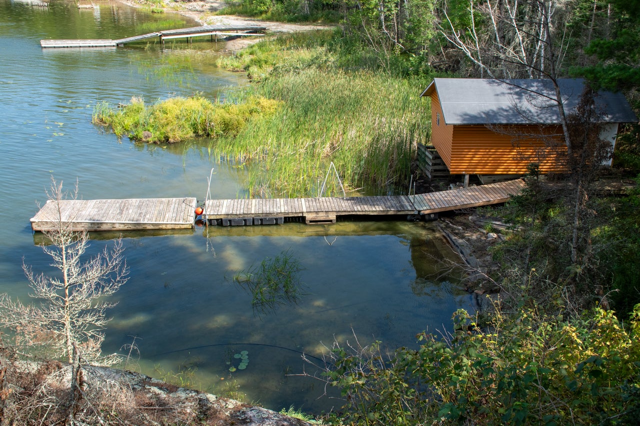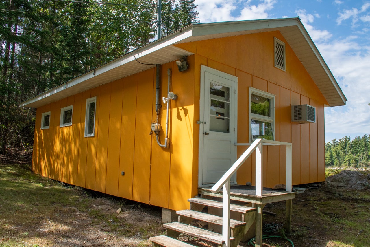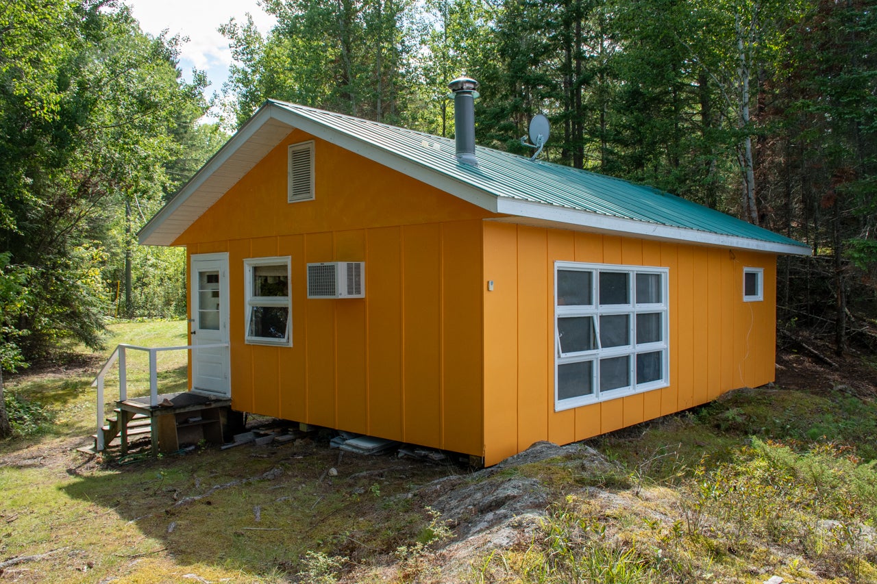 Crown Land to the west enhances the sense of seclusion, and a trail leads down from the cabin to the docking area. A small pump house/tool shed sits along the trail. At the water’s edge, a dry-land storage building/boathouse built on cribs is paired with a dock.