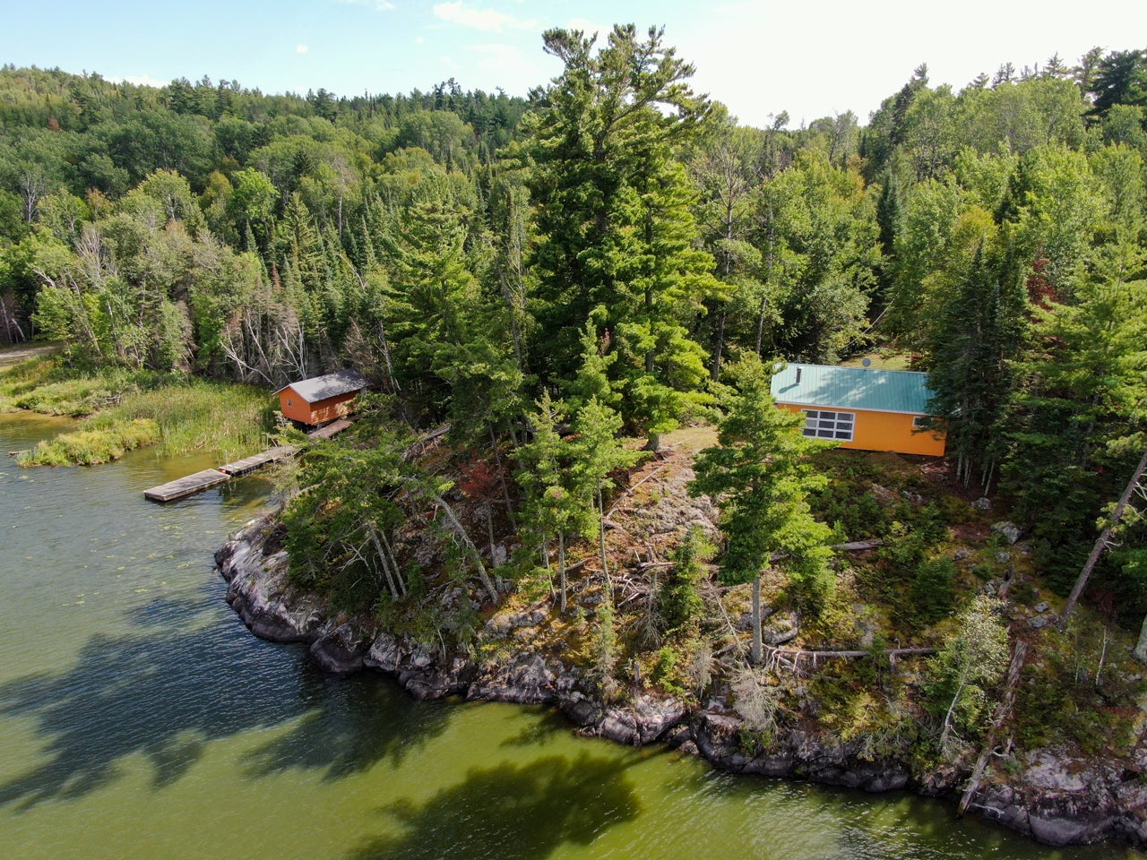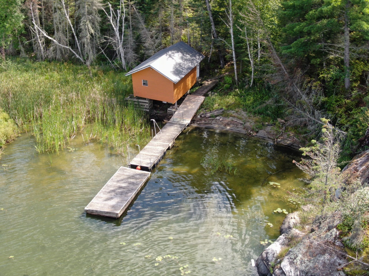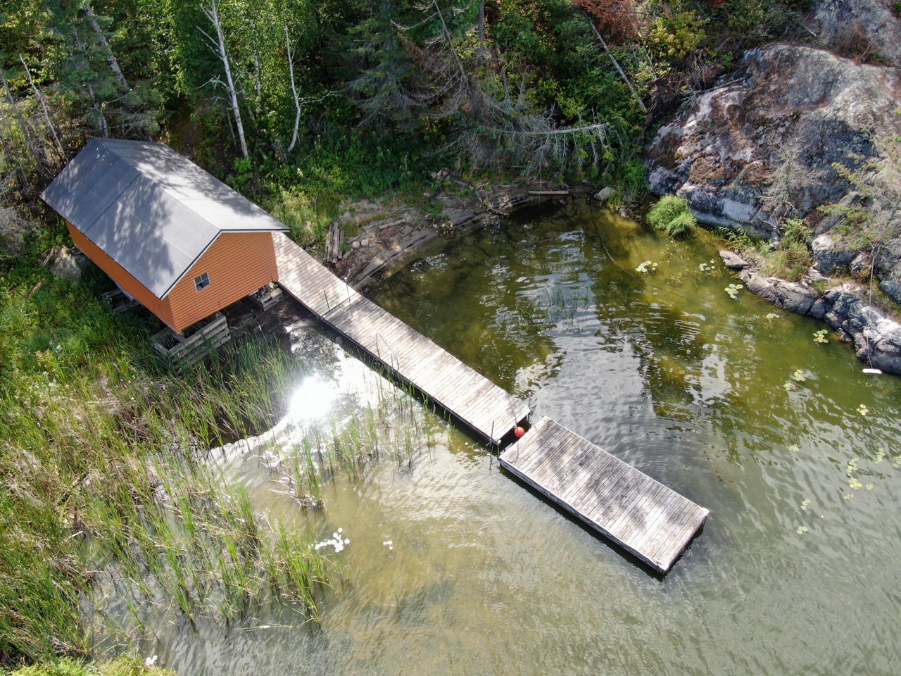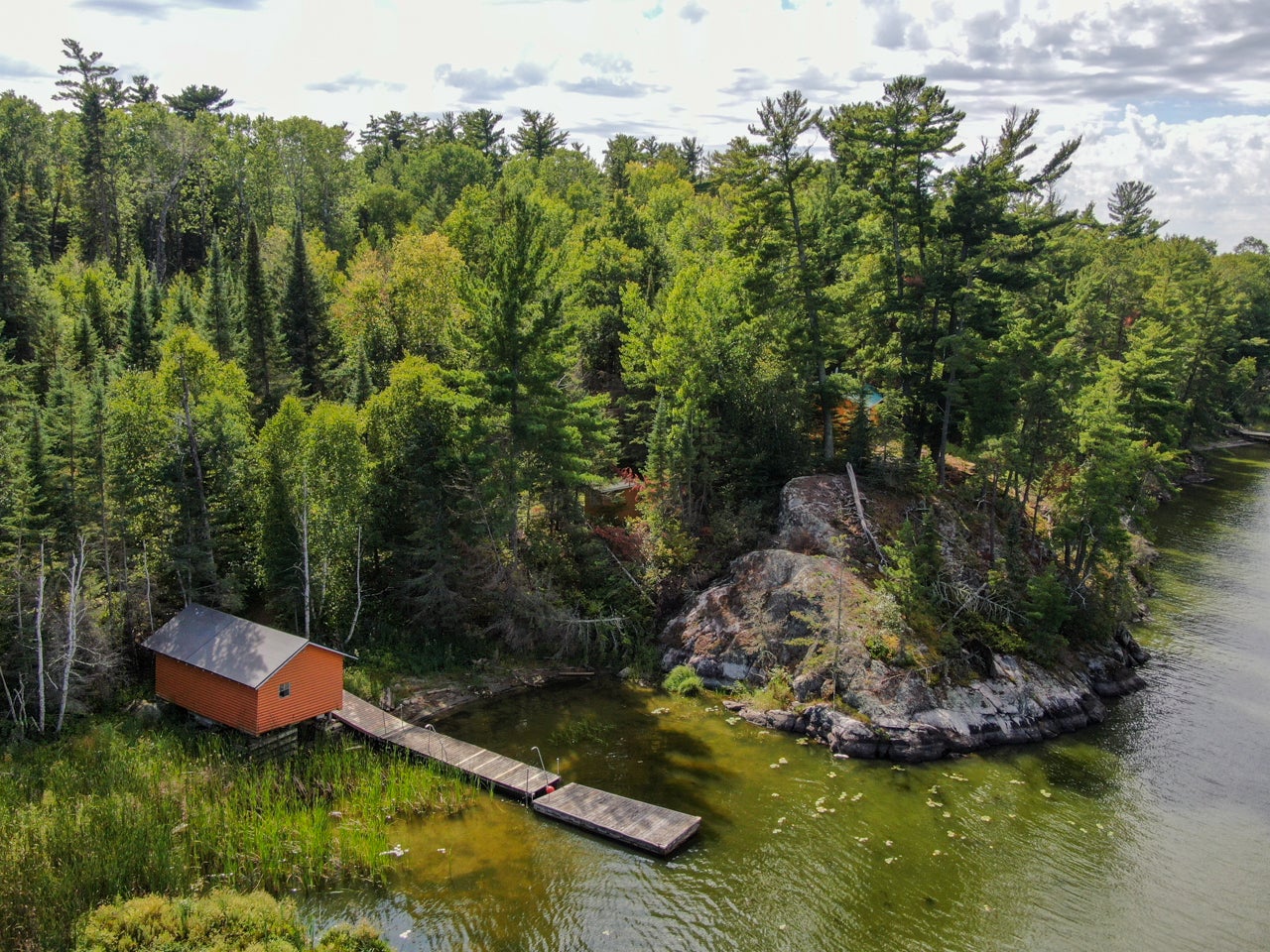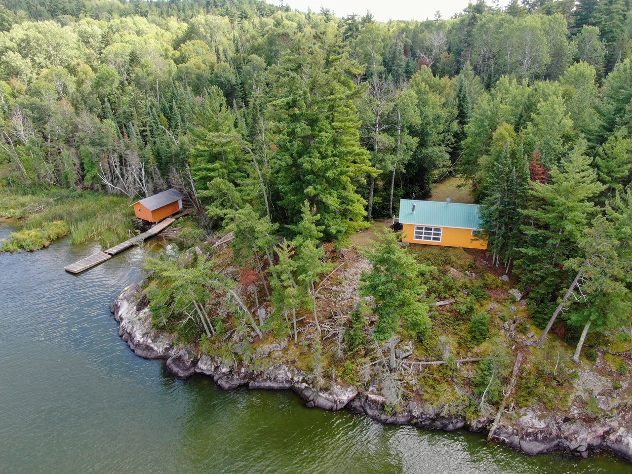 Crown Land to the west enhances the sense of seclusion, and a trail leads down from the cabin to the docking area. A small pump house/tool shed sits along the trail. At the water’s edge, a dry-land storage building/boathouse built on cribs is paired with a dock.