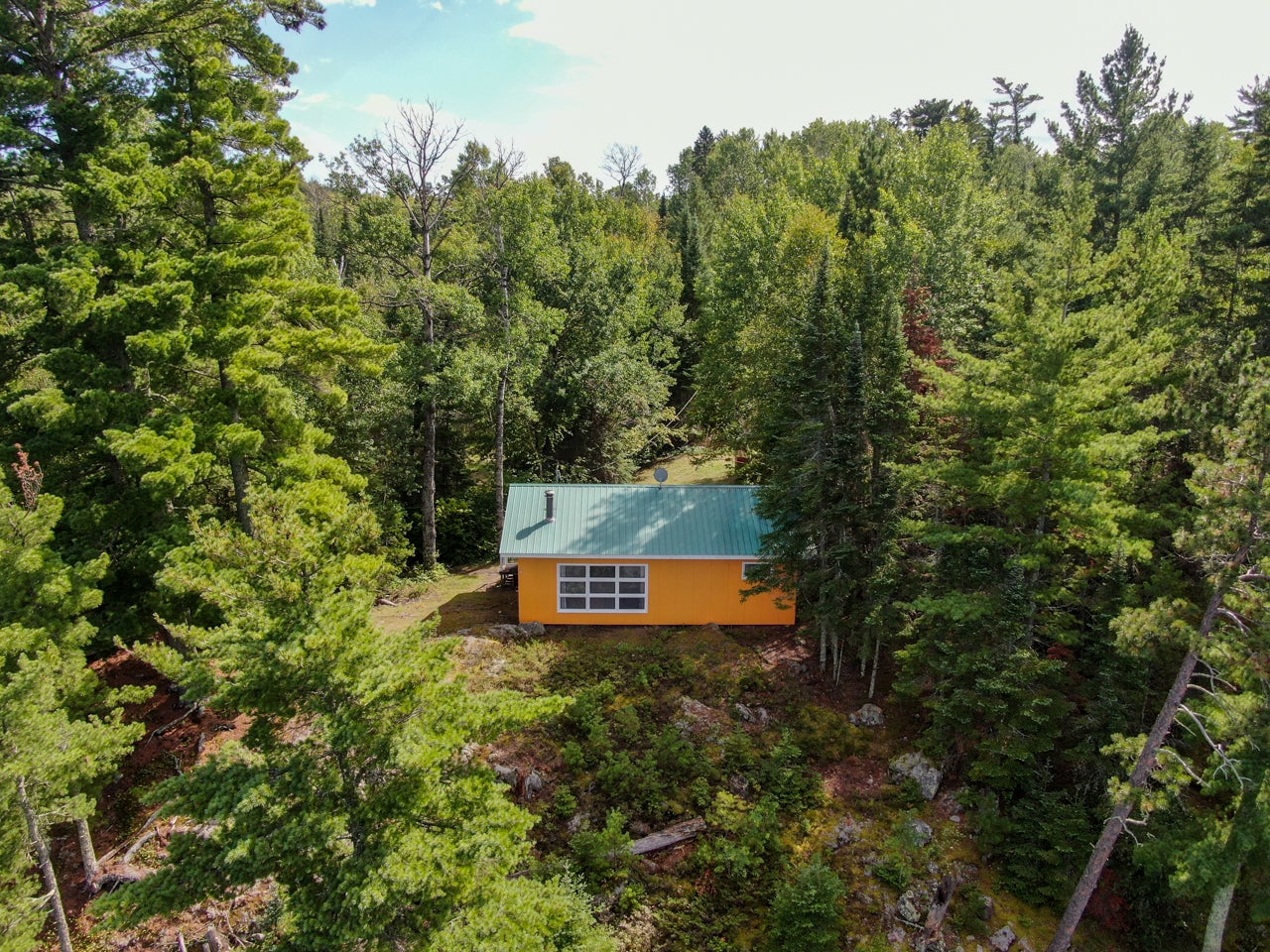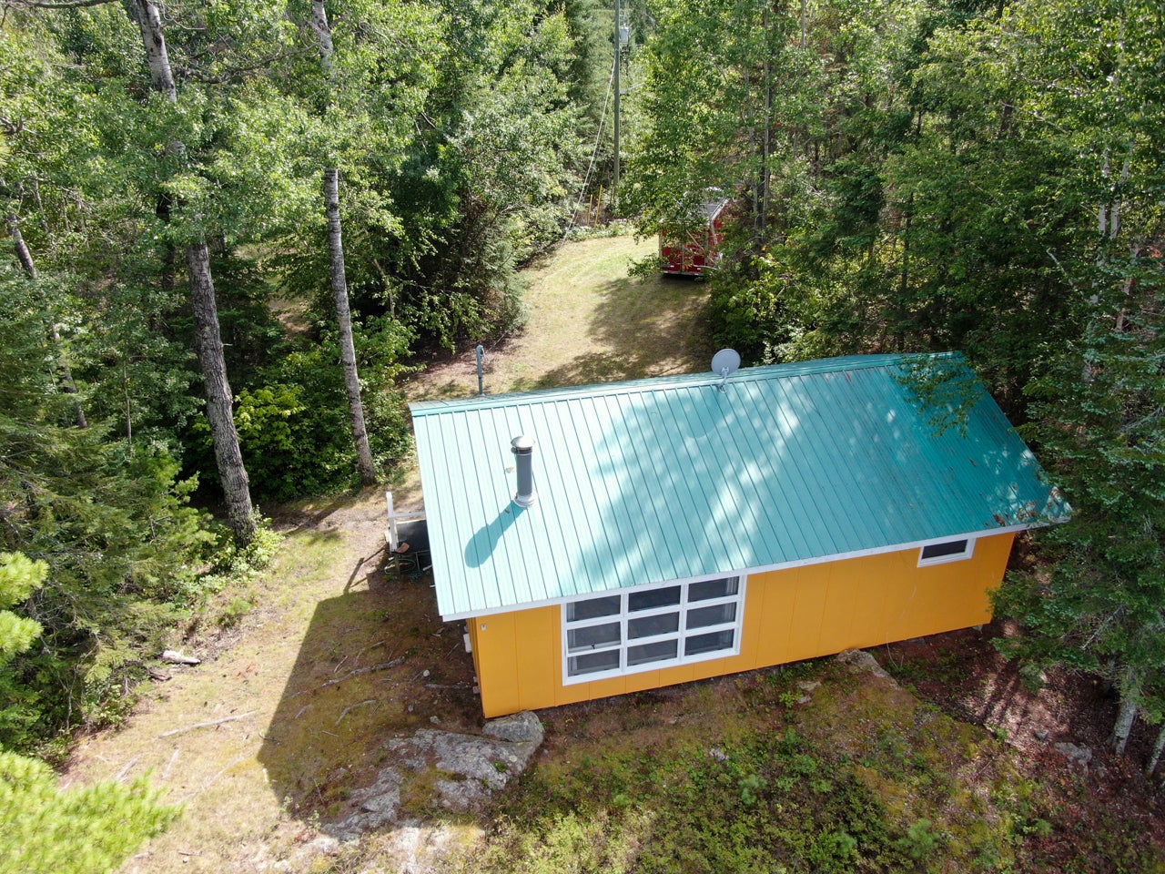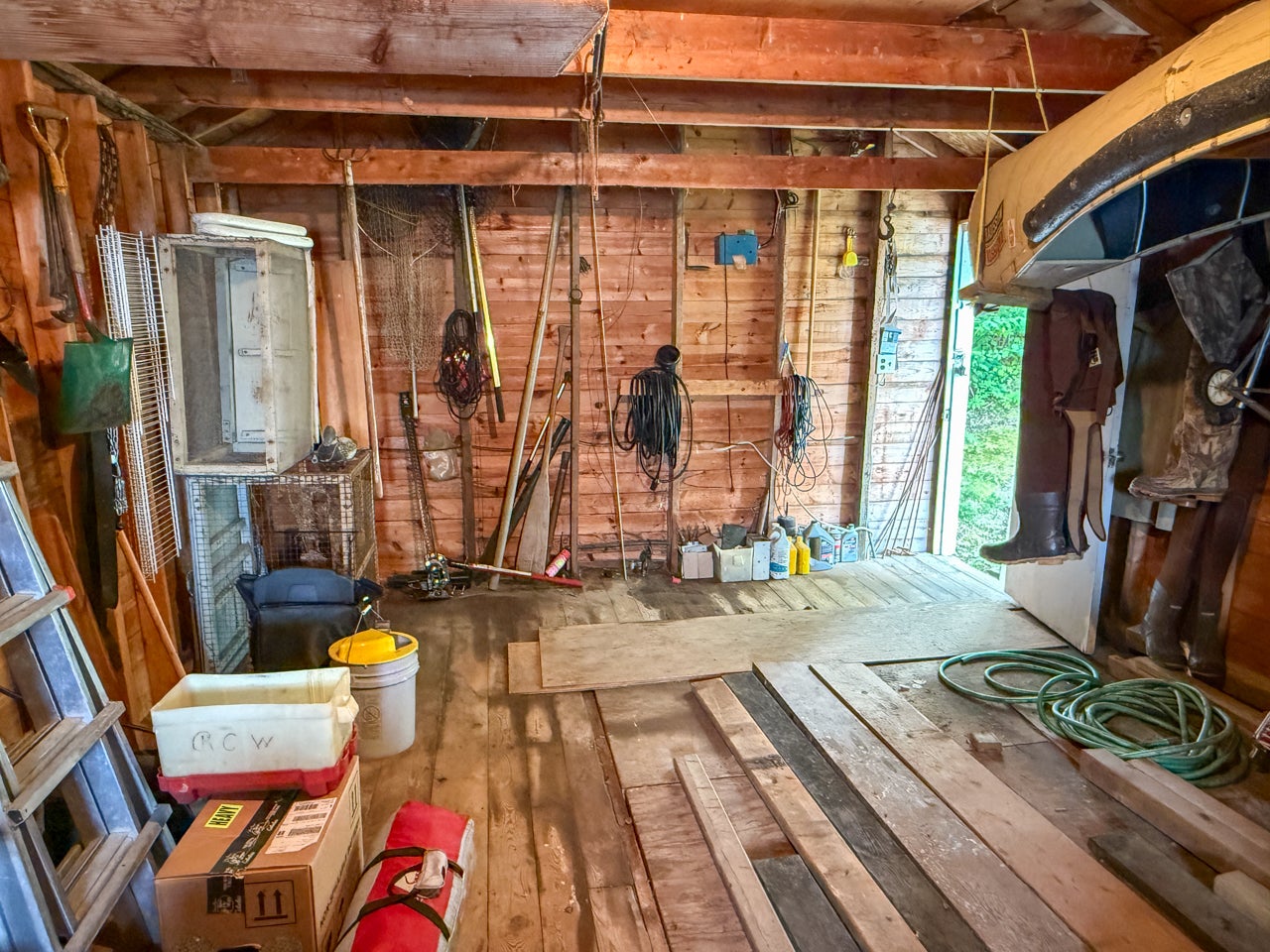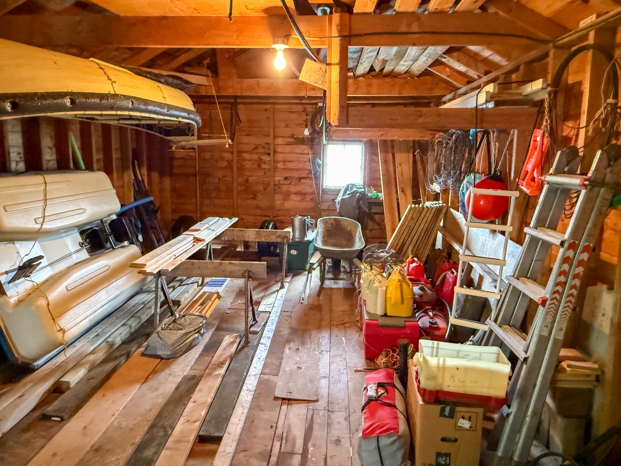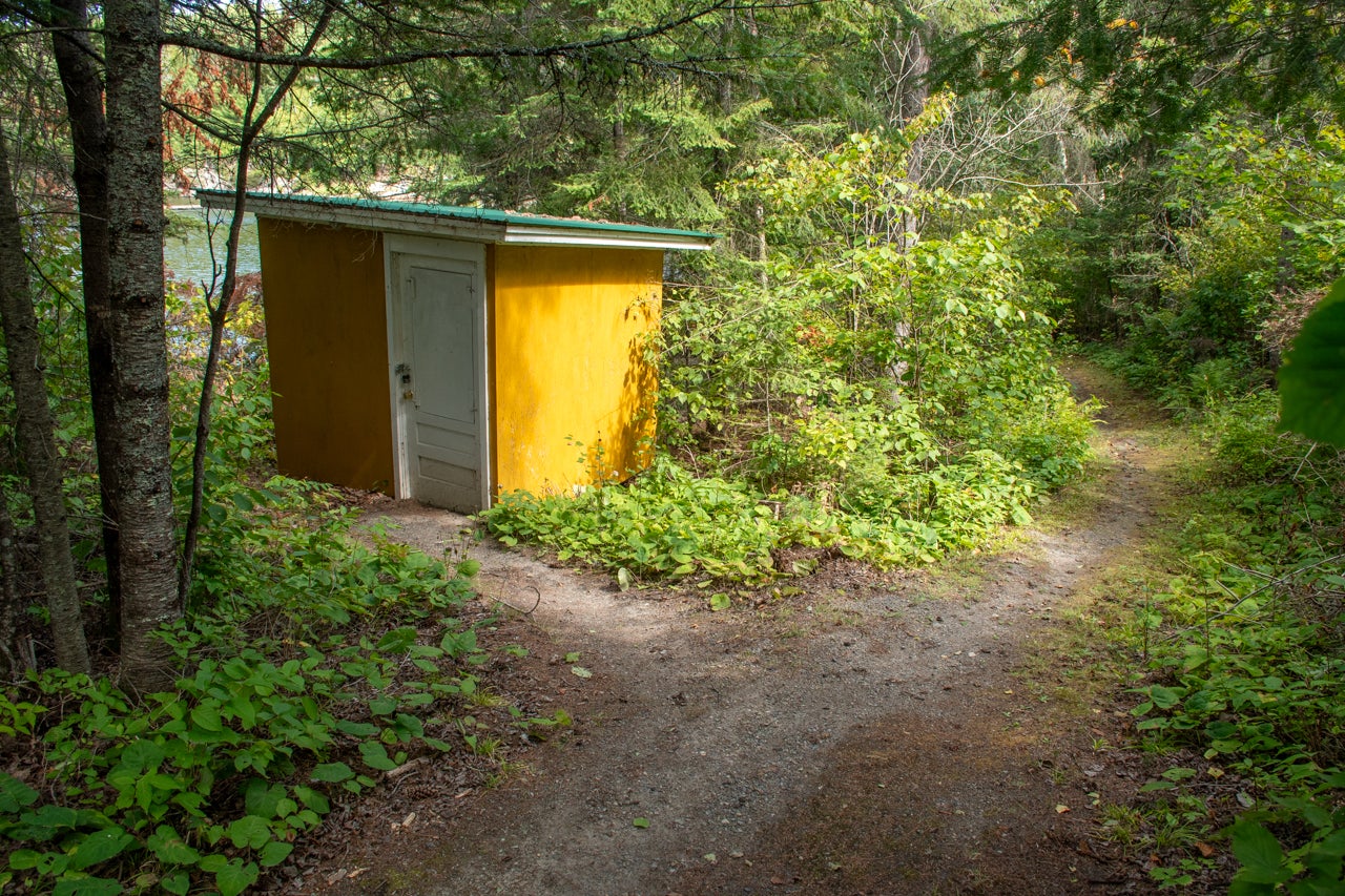 Crown Land to the west enhances the sense of seclusion, and a trail leads down from the cabin to the docking area. A small pump house/tool shed sits along the trail. At the water’s edge, a dry-land storage building/boathouse built on cribs is paired with a dock.