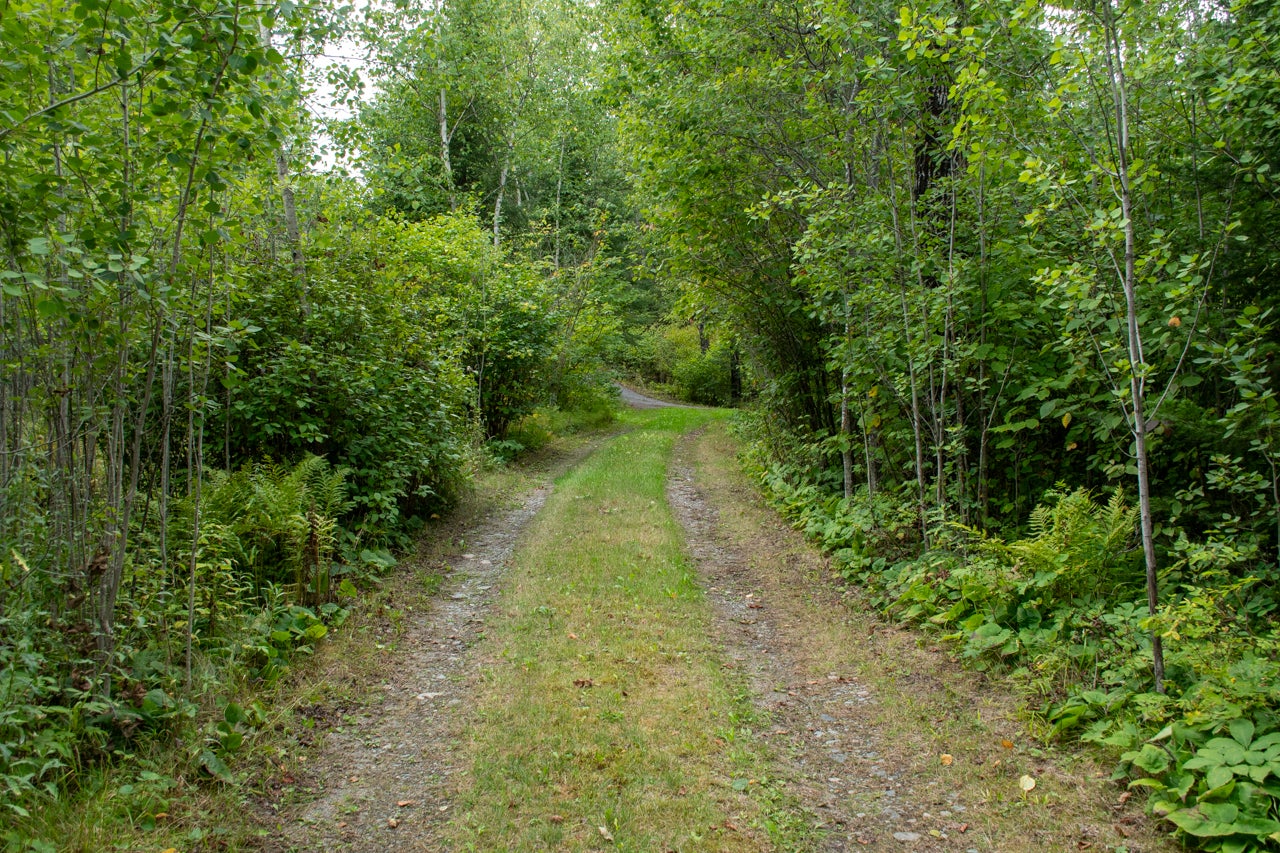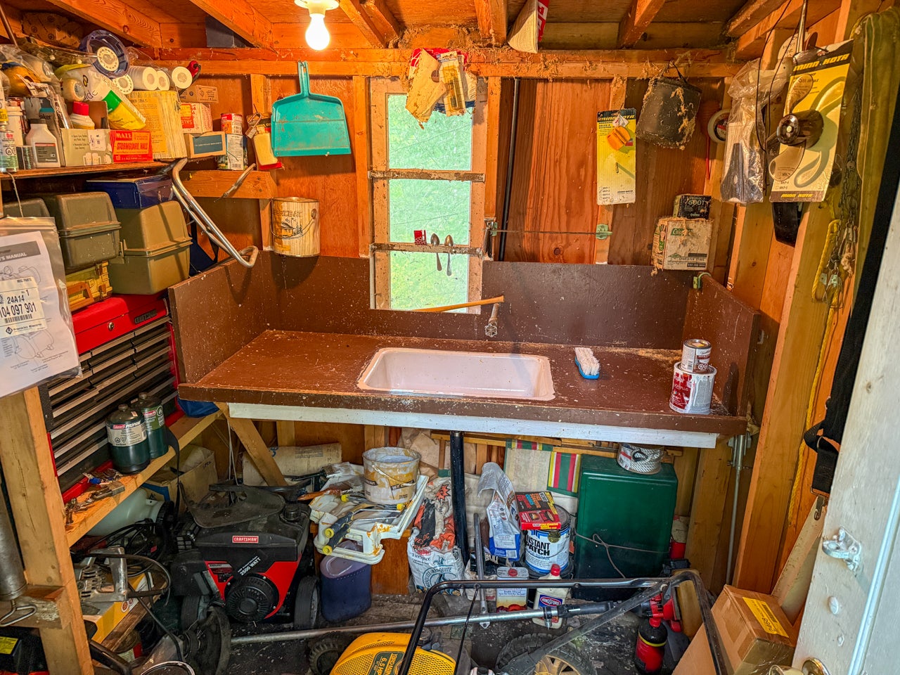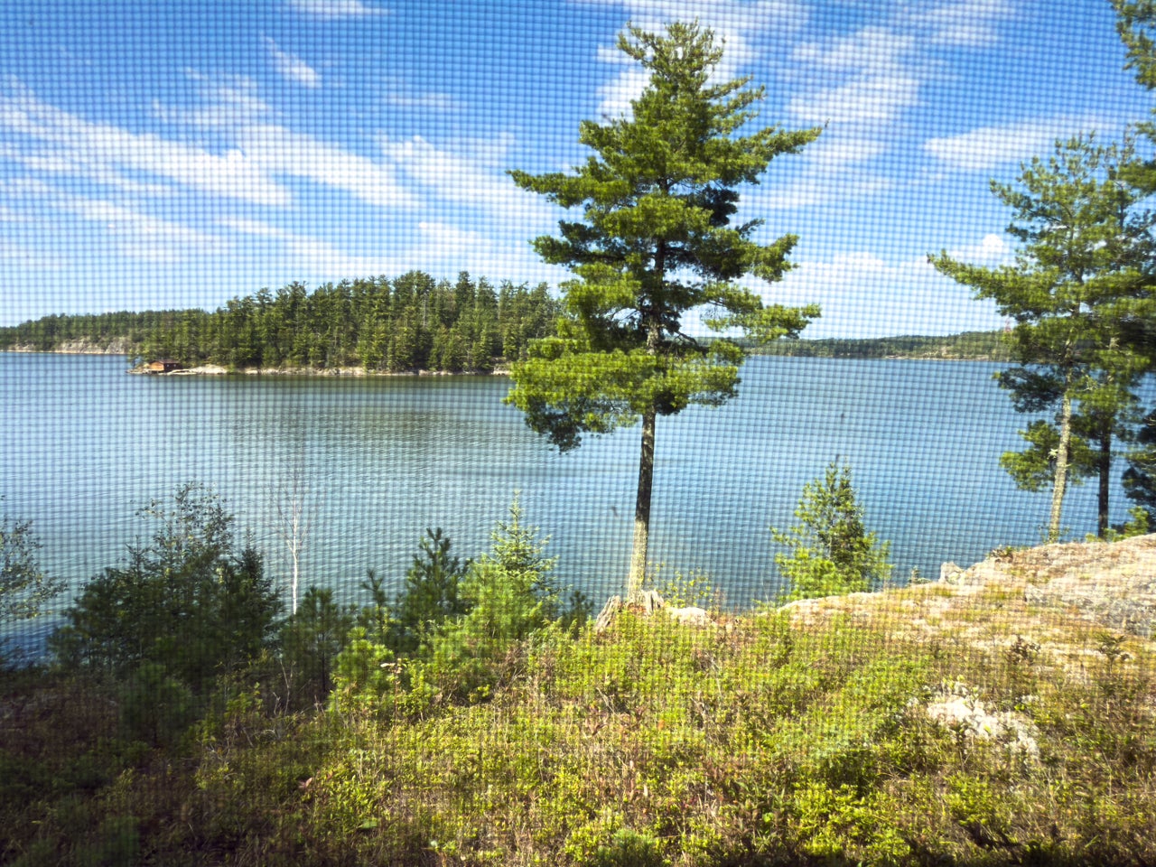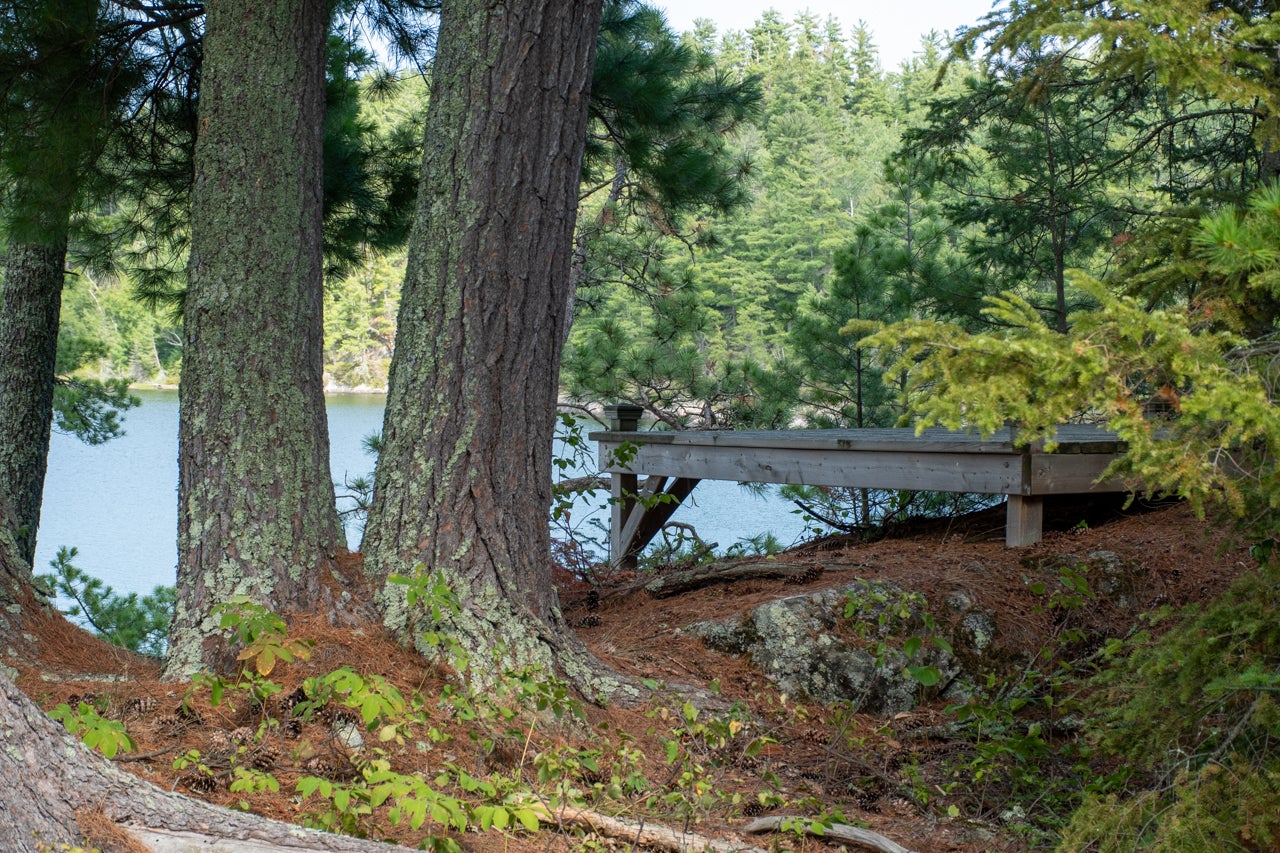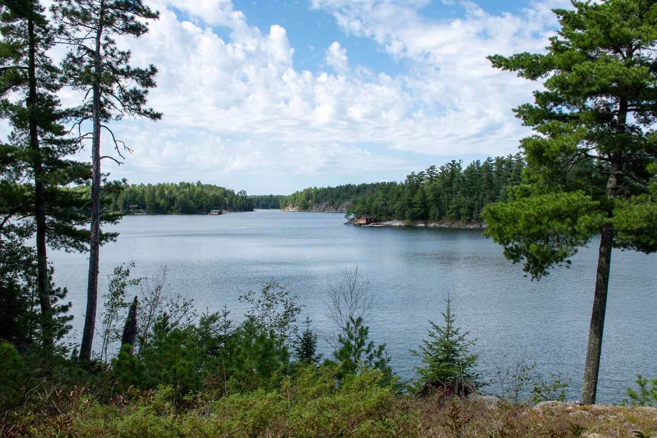 Crown Land to the west enhances the sense of seclusion, and a trail leads down from the cabin to the docking area. A small pump house/tool shed sits along the trail. At the water’s edge, a dry-land storage building/boathouse built on cribs is paired with a dock.