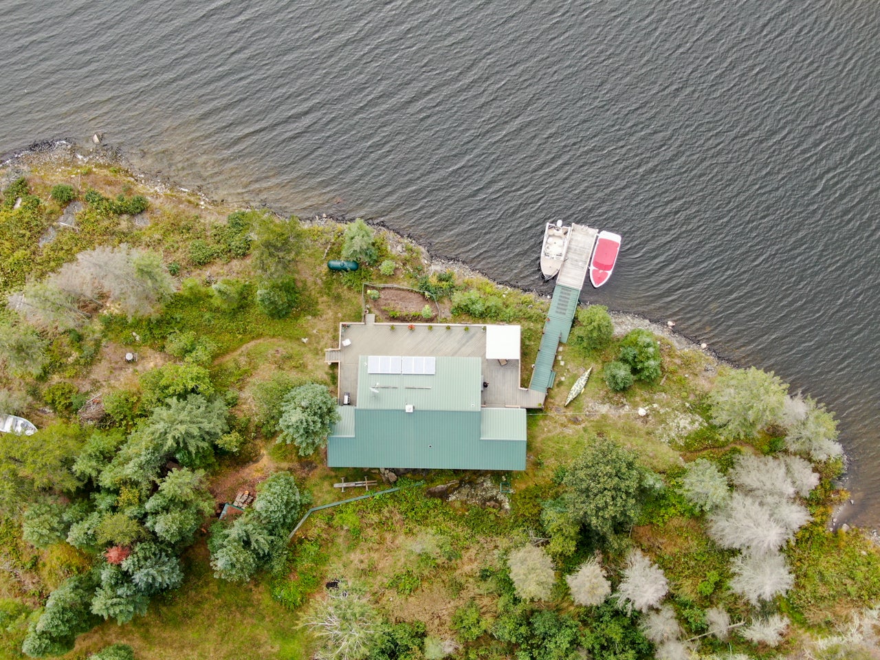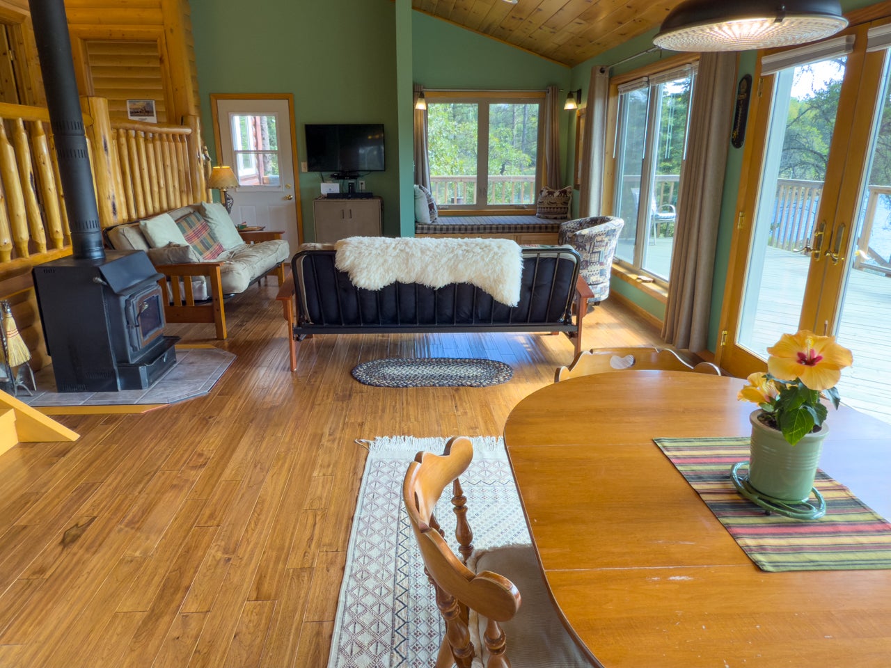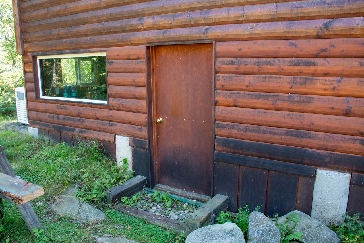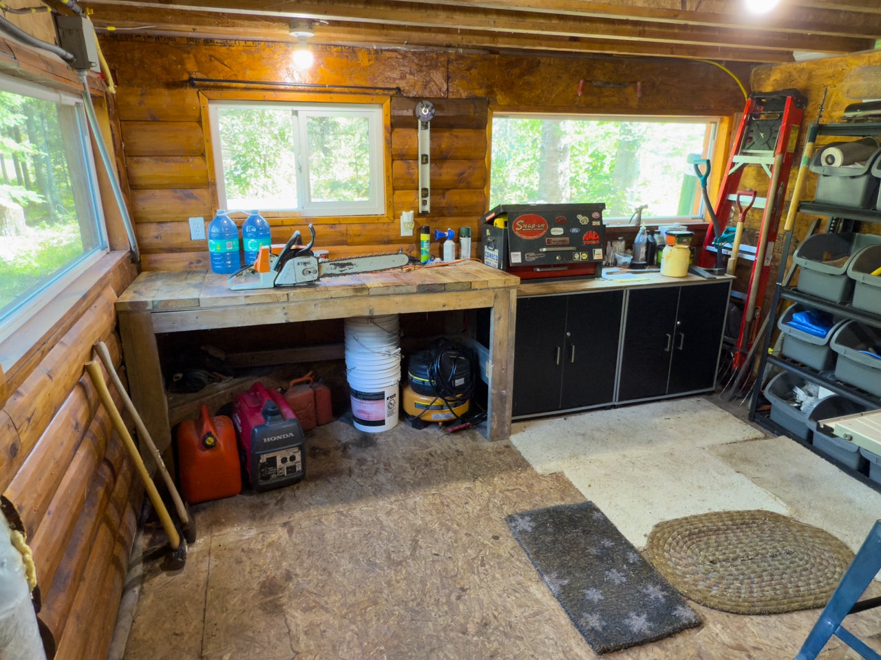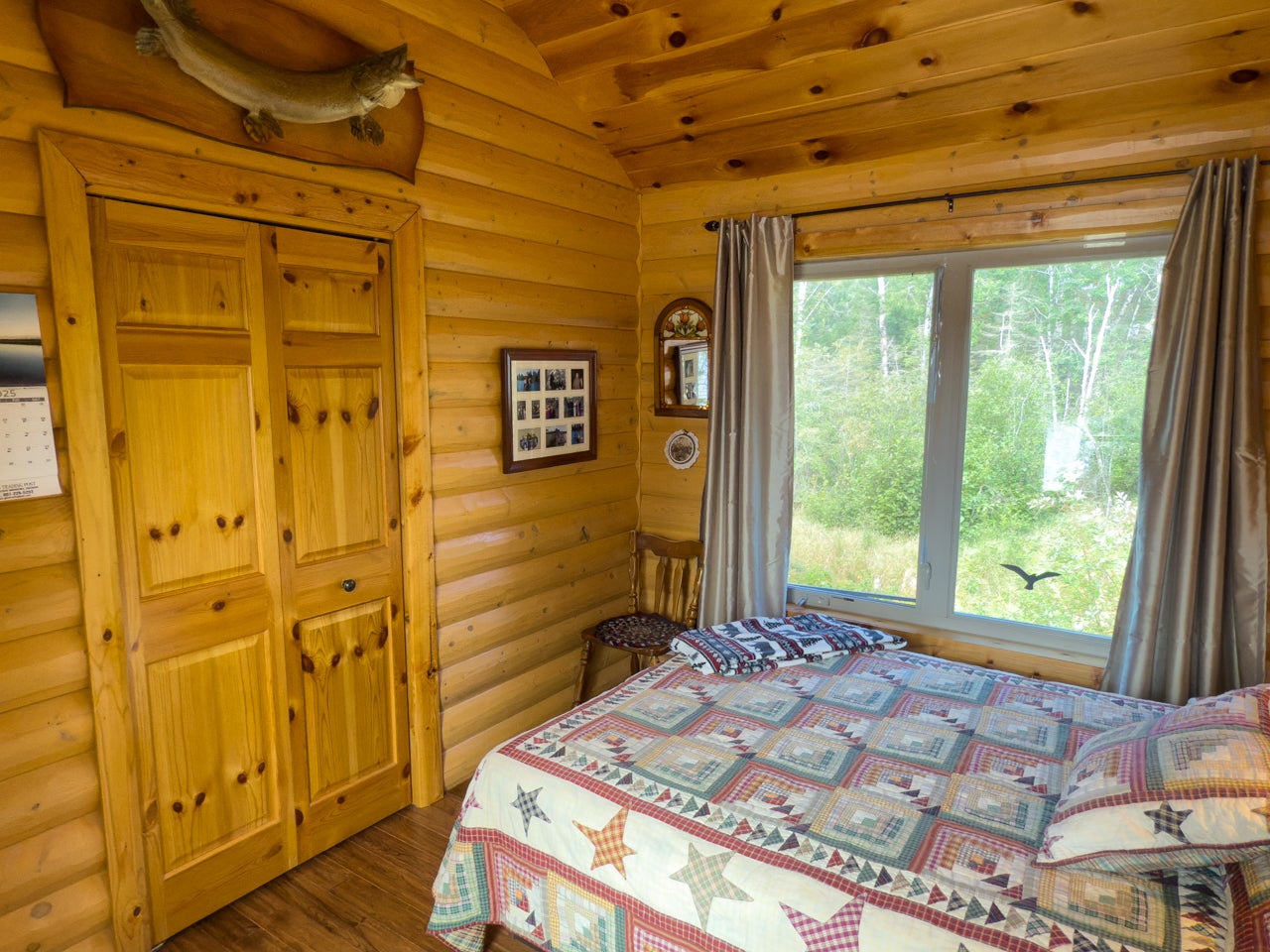 The approx. 1,200 sq. ft. cabin blends craft and comfort: a custom kitchen, ¾ inch hickory flooring, half-log siding inside and out, dual-pane windows, three generous bedrooms, a 4-piece bath, laundry, and a handcrafted log railing. A full-wrap deck spans three sides, while the floating dock sits just steps from the door. Below the cabin, a full shop/bunkie adds utility; a large tent structure on poured piers is prepped for a future bunkie. Garden plots and cleared walking paths knit the site together.
