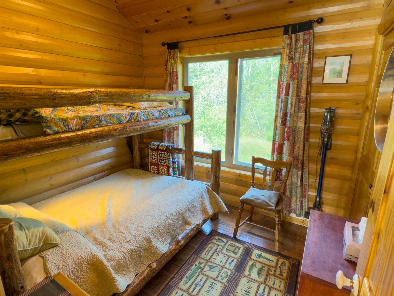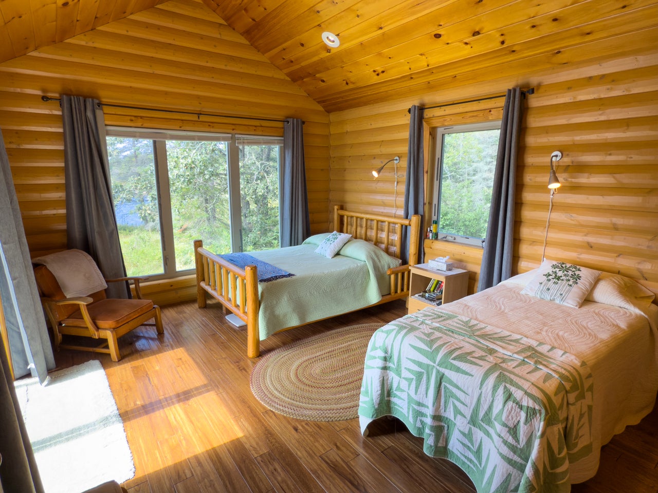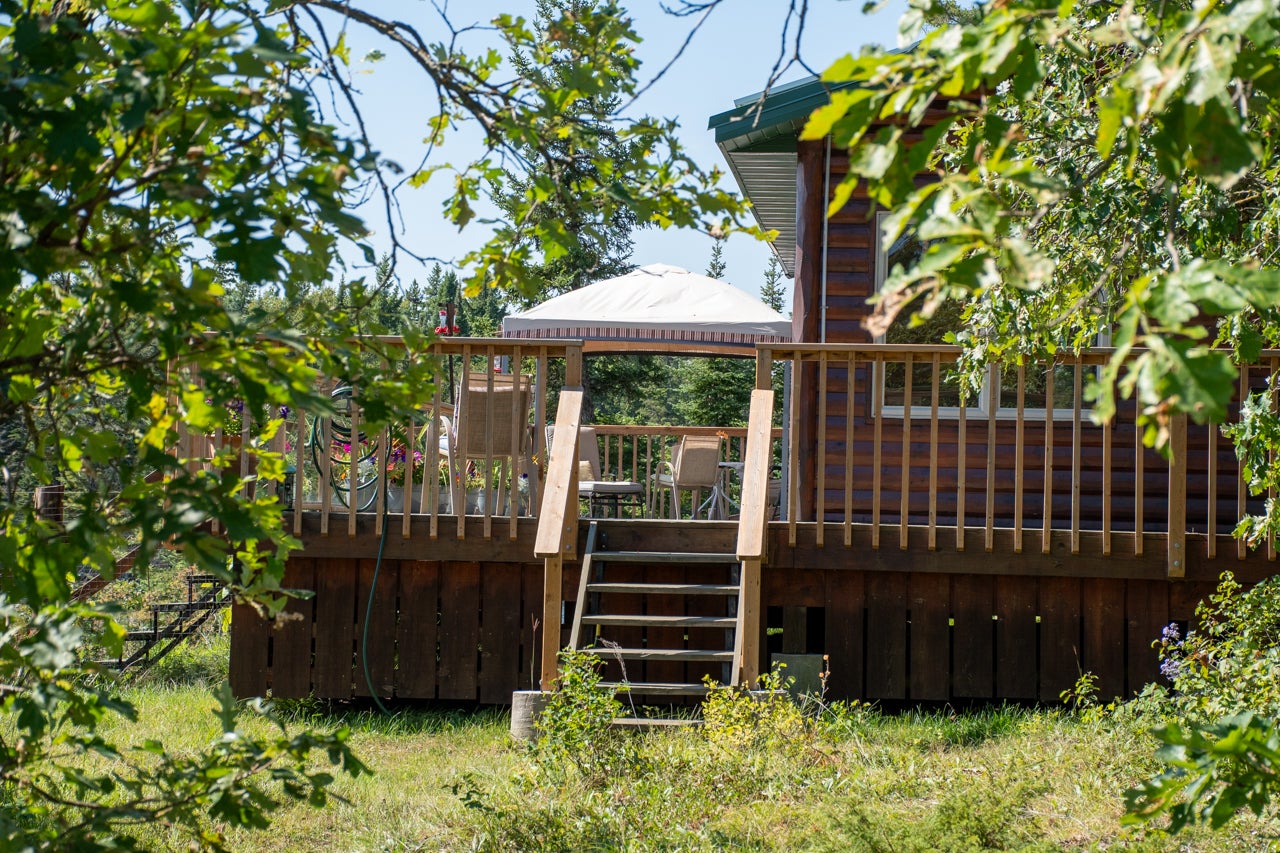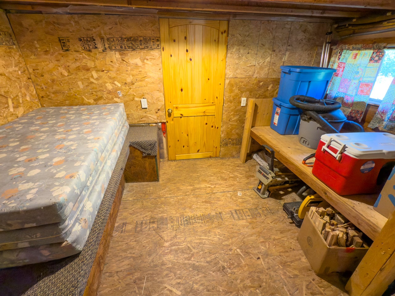 The approx. 1,200 sq. ft. cabin blends craft and comfort: a custom kitchen, ¾ inch hickory flooring, half-log siding inside and out, dual-pane windows, three generous bedrooms, a 4-piece bath, laundry, and a handcrafted log railing. A full-wrap deck spans three sides, while the floating dock sits just steps from the door. Below the cabin, a full shop/bunkie adds utility; a large tent structure on poured piers is prepped for a future bunkie. Garden plots and cleared walking paths knit the site together.